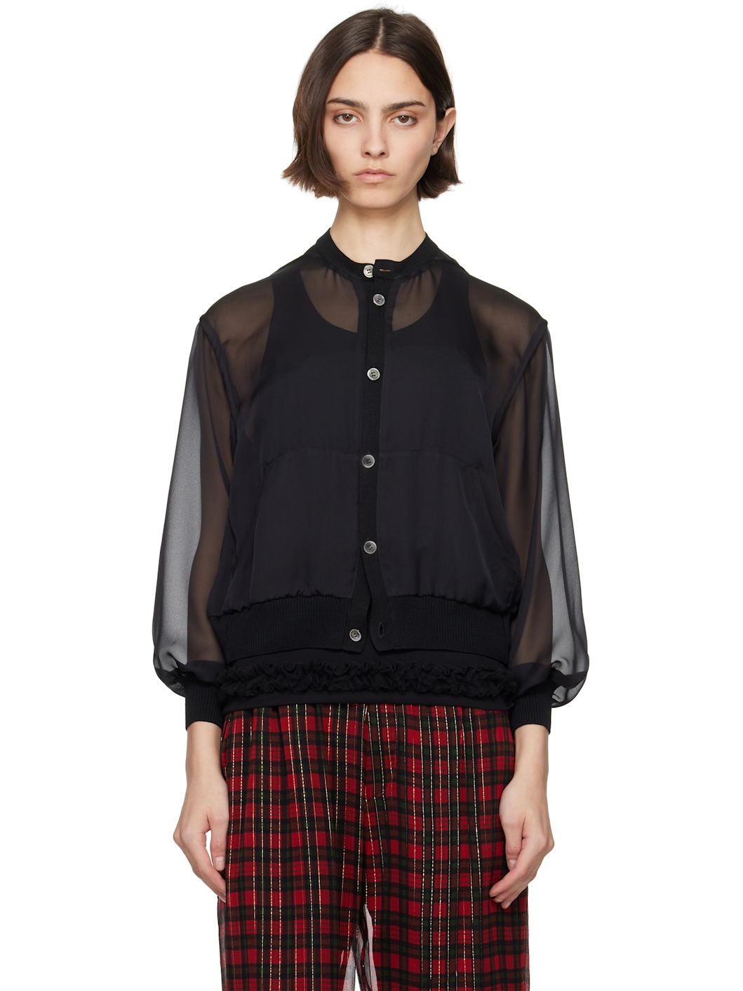 Sheer polyester chiffon cardigan. · Rib-knit crewneck, hem, and cuffs · Button closure · Patch pockets · Dropped shoulders Supplier color: Black Body: 100% polyester. Trim: 88% rayon, 12% silk. Made in Japan 251414F095000