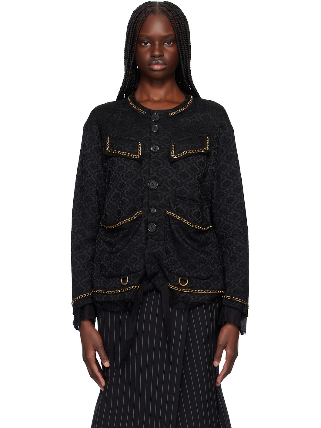 Stretch acrylic-blend brocade jacket. Jacquard graphic pattern and curb chain appliques throughout. · Round neck · Button closure · Flap and patch pockets · D-rings at front · Chiffon trim and frayed edge at hem and cuffs · Cutout at elbows · Full chiffon lining Supplier color: Black base Body: 59% acrylic, 25% polyester, 13% nylon, 3% polyurethane. Lining: 70% rayon, 30% nylon. Made in Japan 251414F063000
