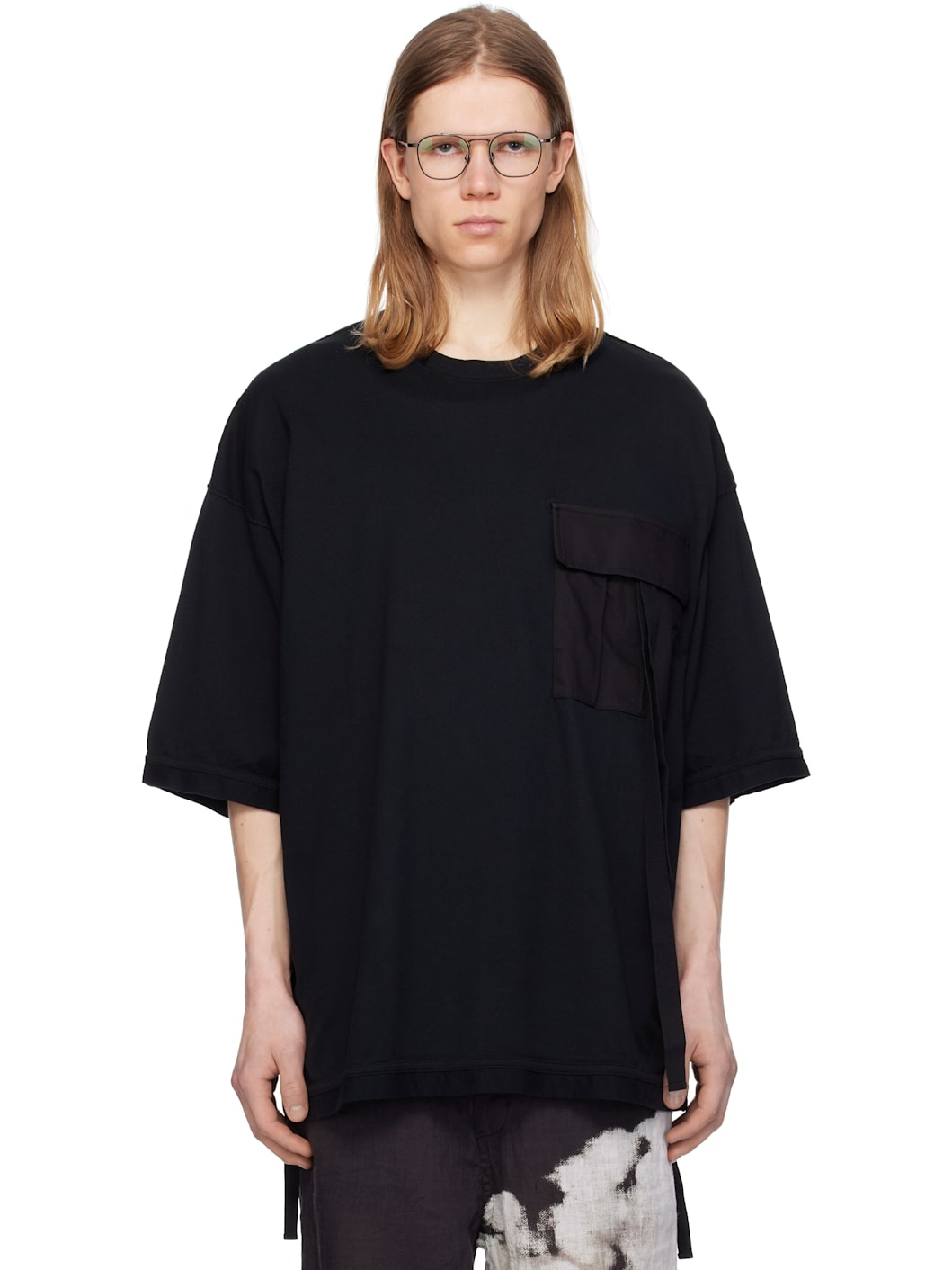 Cotton jersey T-shirt. Overlock stitching throughout. · Rib-knit crewneck · Twill flap pocket with straps at chest · Jersey trim at hem, dropped shoulders, cuffs, and back Supplier color: Black Body 1: 100% cotton. Body 2: 56% cotton, 44% polyester. Trim: 100% cotton. Made in Japan 251414M213017