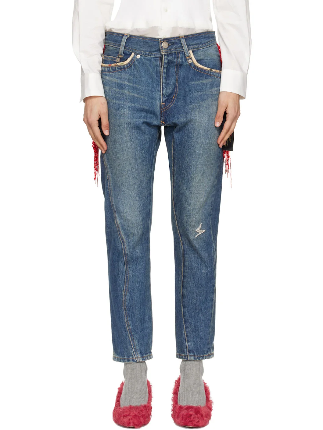 Non-stretch denim jeans. · Fading, whiskering, and subtle distressing throughout · Asymmetric paneled construction · Belt loops · Five-pocket styling · Zip fly · Beaded graphic patch at front · Beaded fringe at outseams · Logo flag at outseam and back pocket · Logo patch at back waistband · Logo-engraved silver-tone hardware · Contrast stitching in tan Supplier color: Indigo Body: 100% cotton. Trim: 100% polyester. Made in Japan 252414F069004