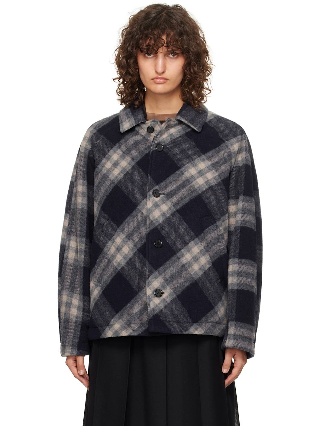 Padded brushed wool-blend flannel jacket. Check pattern throughout. · Spread collar · Button closure · Welt pockets · Raglan sleeves · Welt pockets at interior · Full satin lining Supplier color: Navy check Body: 60% wool, 30% polyester, 4% acrylic, 3% rayon, 3% nylon. Fill: 100% polyester. Lining: 100% cupro. Made in Japan 242414F063001