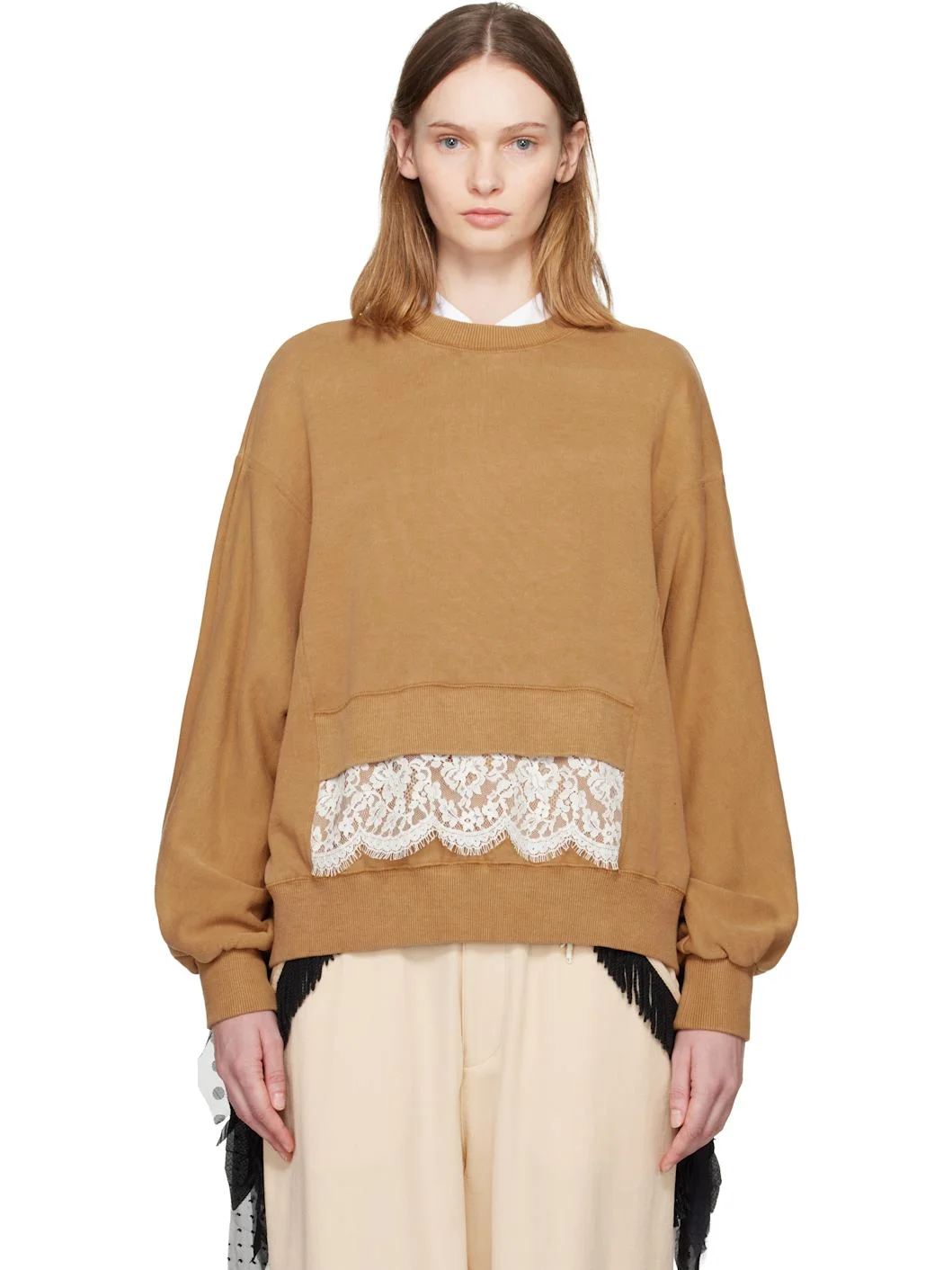 French terry sweatshirt. · Rib-knit crewneck, hems, and cuffs · Floral lace panel at waist · Fringe at side seams Supplier color: Darkorange Body: 100% cotton. Trim: 75% polyester, 10% cotton, 10% rayon, 5% linen. Made in Japan 252414F098004