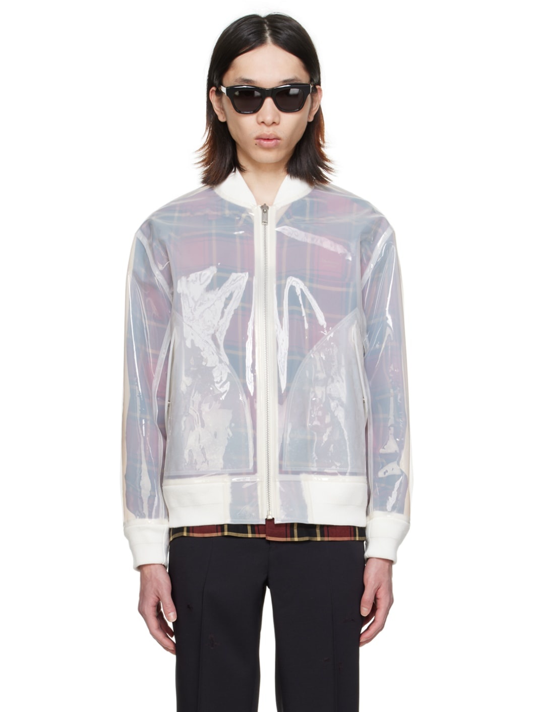 Transparent PVC bomber jacket. · Rib knit stand collar, hem, and cuffs · Zip closure · Flap pockets · Logo printed at back · Unlined Supplier color: White Body: 100% pvc. Trim: 50% cotton, 50% polyester. Made in Japan 241414M175007