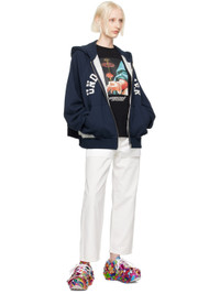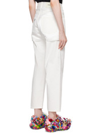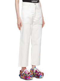 Non-stretch denim jeans. · Belt loops · Five-pocket styling · Zip-fly · Partial polyester satin overlay at front and back · Leather logo patch at back waistband · Logo flag at back pocket · Logo-engraved silver-tone hardware Supplier color: White Body 1: 100% cotton. Body 2: 100% polyester. Made in Japan 242414F069002