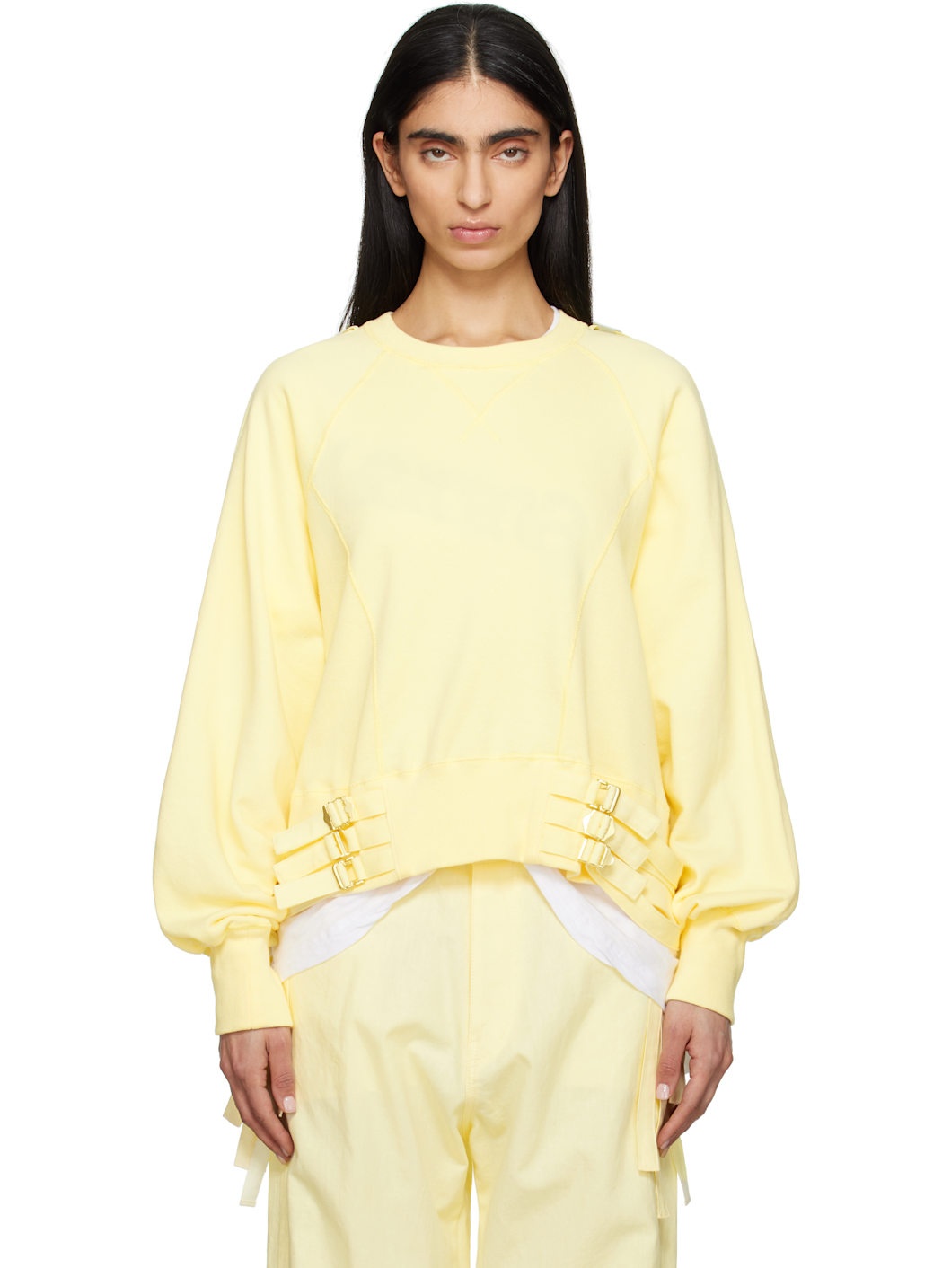 French terry sweatshirt. · Rib-knit crewneck, hem, and cuffs · Belt loops and cinch belts at hem · Cinch strap at shoulders · Raglan sleeves Supplier color: L.Yellow Body: 100% cotton. Trim: 70% cotton, 30% silk. Made in Japan 251414F098006