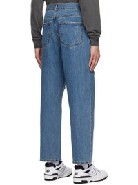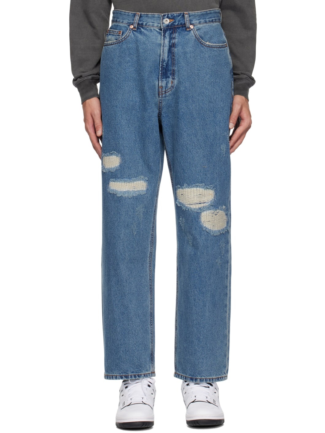 Wide-leg 13 oz non-stretch denim jeans. Fading and distressing throughout. · Belt loops · Five-pocket styling · Zip-fly · Contrast stitching in tan Supplier color: Indigo washed 100% cotton. Made in South Korea 241155M186004