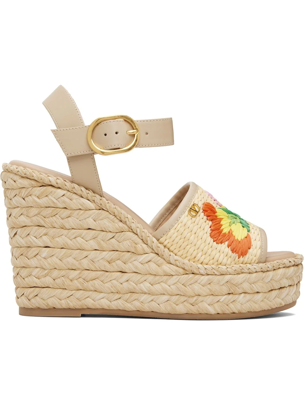 Buffed leather and woven raffia heeled sandals. · Open toe · Logo hardware and floral embroidery at vamp · Pin-buckle ankle strap · Logo stamp at padded footbed · Buffed leather lining · Braided raffia wedge heel and midsole · Treaded rubber sole · Platform: H1.5" · Heel: H4.25" Supplier color: Naturale/Dusty Upper: leather, raffia. Sole: rubber. Made in Spain 252807F125002