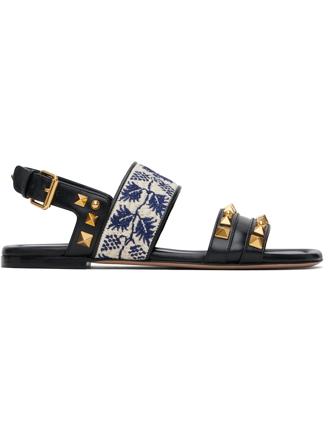 Buffed leather sandals in black. · Signature pyramid studs throughout · Open square toe · Graphic-embroidered strap at vamp · Pin-buckle slingback strap · Buffed leather lining · Logo printed at padded footbed · Polished leather sole with rubber injection · Antiqued brass-tone hardware Supplier color: Black Upper: textile, leather. Sole: leather, rubber. Made in Italy 251807F124005
