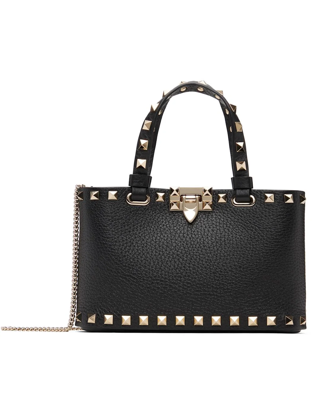 Pebble-grained calfskin top handle bag. · Signature pyramid studs throughout · Fixed carry handles · Detachable curb chain crossbody strap · Tab-slot closure · Two card slots at interior · Nappa leather lining · H5" x W7.5" x D2" Supplier color: Black Calfskin. Made in Italy 252807F046001