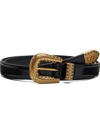 Polished calfskin belt. · Keeper loop at length · Logo hardware at end · Pin-buckle fastening · Engraved antiqued gold-tone hardware · W0.75" Supplier color: Black Calfskin. Made in Italy 252807M131003