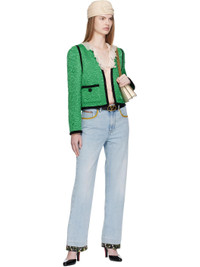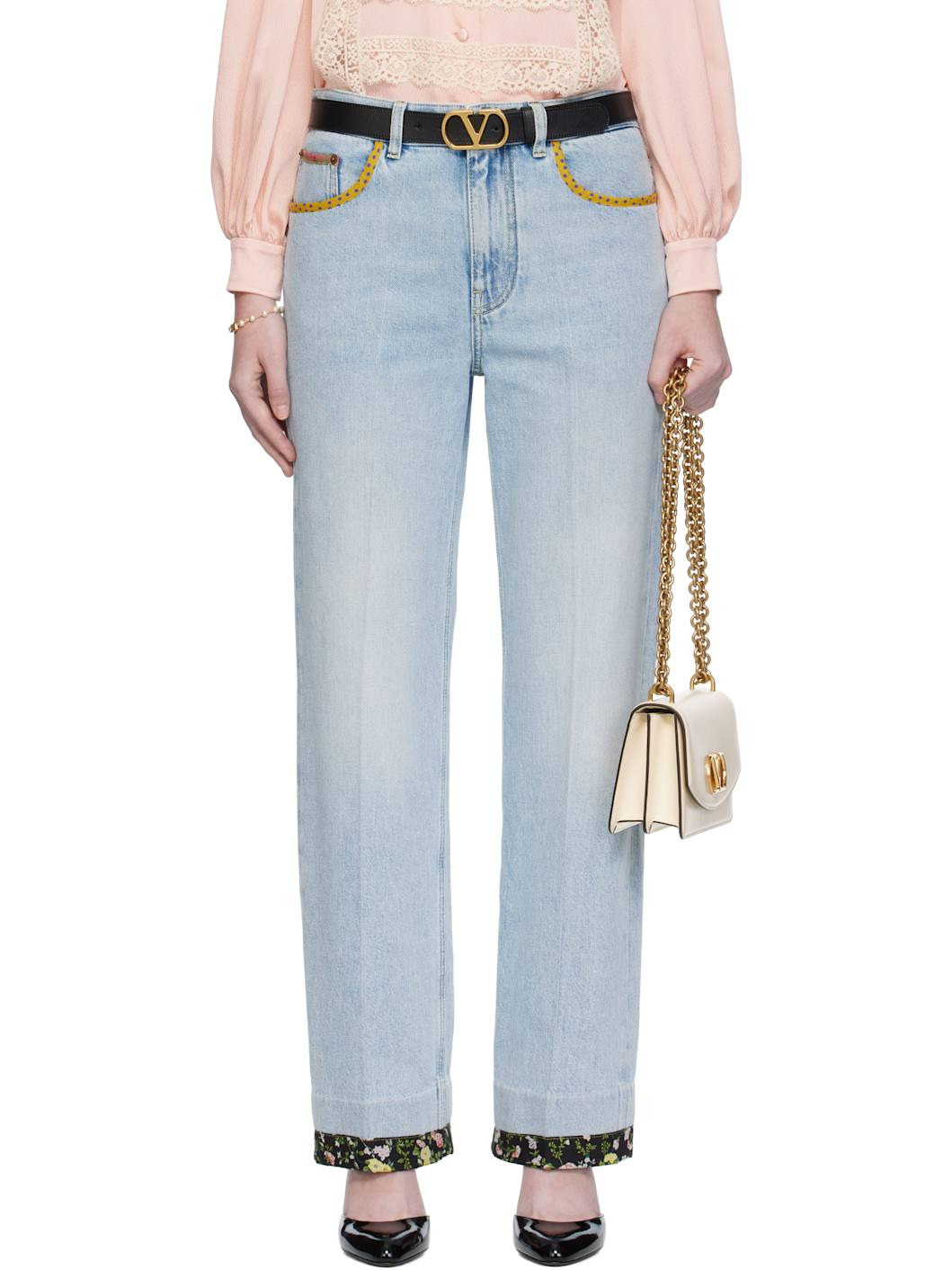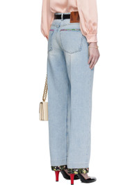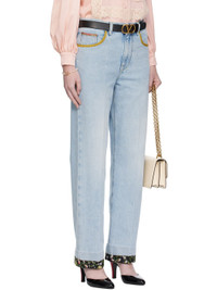 Non-stretch denim jeans. · Fading and floral-printed trim throughout · Belt loops · Five-pocket styling · Zip fly · Creased legs · Leather logo patch at back waistband · Logo-engraved bronze-tone hardware · Contrast stitching in yellow Supplier color: Denim Body: 100% cotton. Trim 1: 100% calfskin. Trim 2: 69% polyester, 31% cotton. Trim 3: 100% cotton. Made in Italy 252476F069001