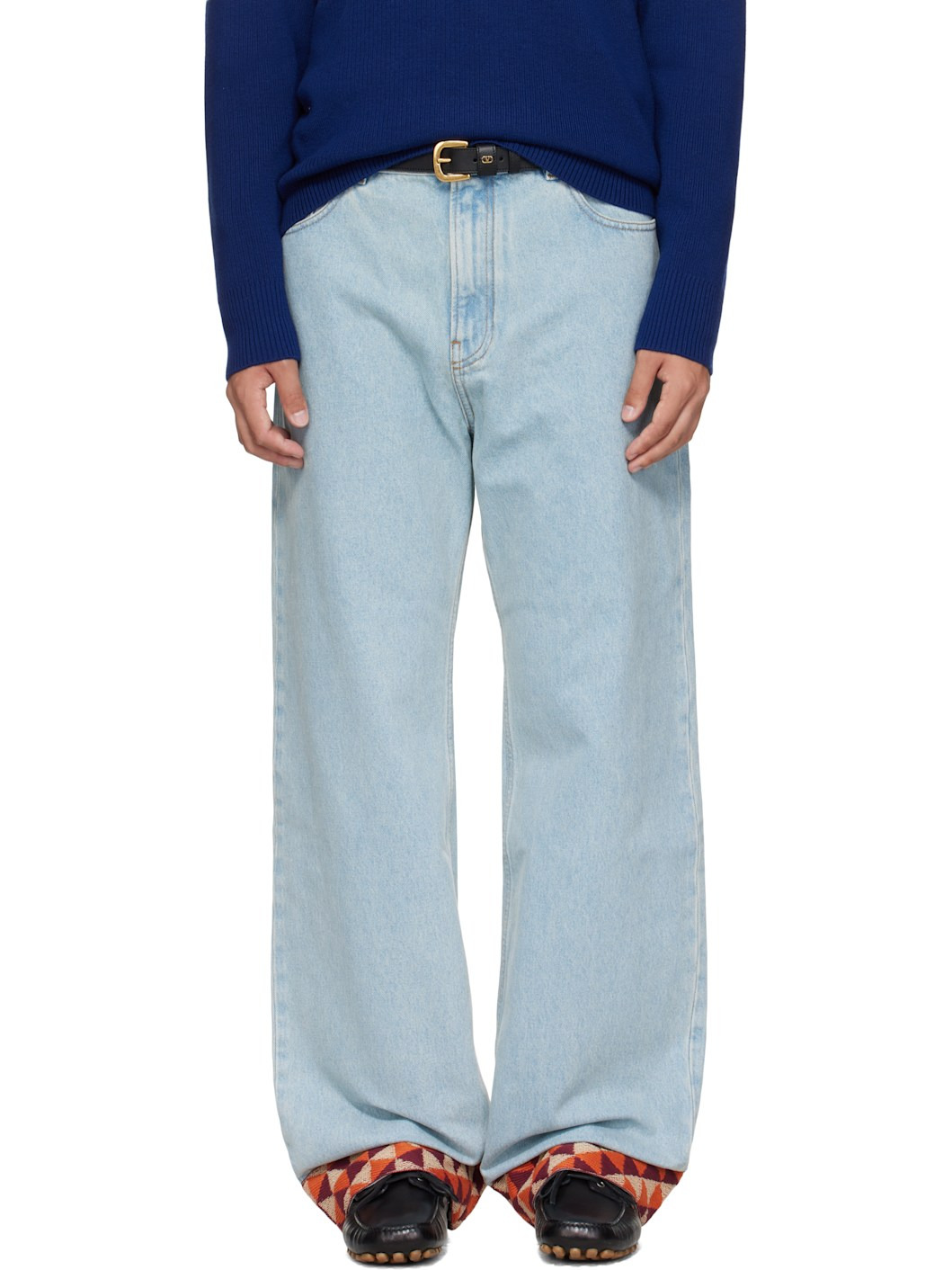 Non-stretch denim jeans. · Fading throughout · Loose-fit · Belt loops · Five-pocket styling · Zip fly · Jacquard graphic pattern at cuffs · Logo patch at back waistband · Contrast stitching in tan Supplier color: Denim Body: 100% cotton. Trim: 69% cotton, 31% polyester. Made in Italy 252476M186000