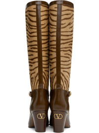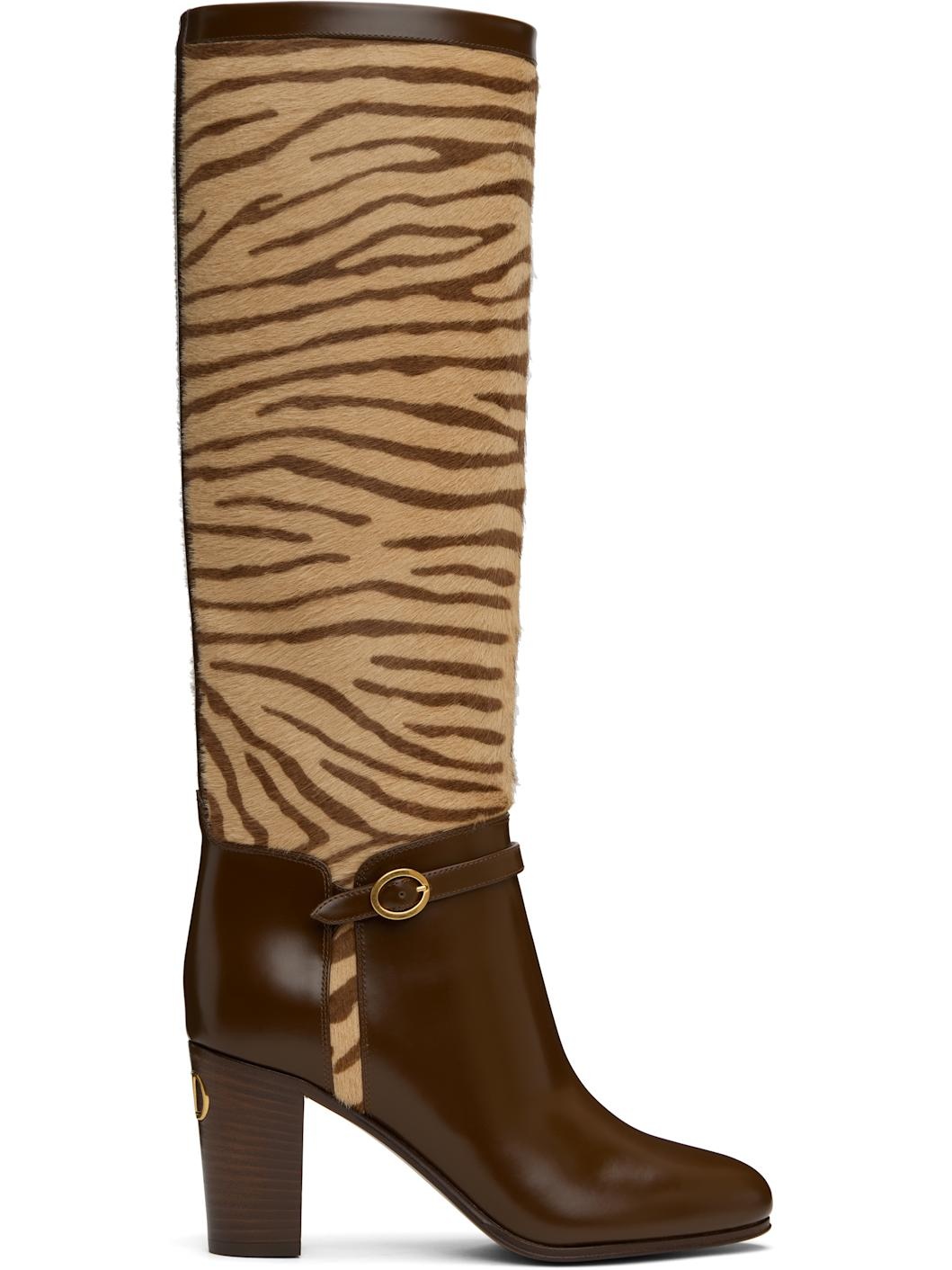 Knee-high calf-hair and buffed calfskin boots in brown and beige. · Graphic pattern printed throughout · Pin-buckle strap at vamp · Buffed leather lining · Logo hardware at heel · Stacked leather block heel with rubber injection · Leather sole · Antiqued brass-tone hardware · Heel: H3" Supplier color: Beige/Tobacco Upper: calfskin. Sole: leather, rubber. Made in Italy 251807F115000