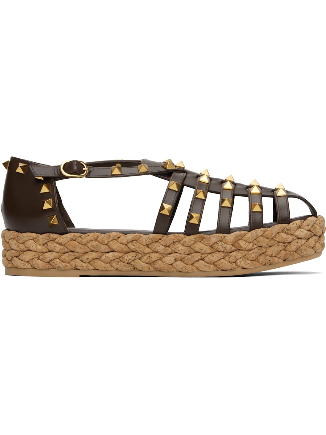 Buffed leather sandals in brown. · Signature pyramid studs throughout · Straps at vamp · Pin-buckle strap at collar · Buffed leather and suede lining · Braided cork platform midsole · Treaded rubber sole · Antiqued brass-tone hardware · Platform: H1.5" Supplier color: Bark brown/Natural Upper: leather. Sole: rubber. Made in Spain 251807F119002