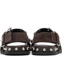 Suede flat sandals. · Studs and rivets throughout · Open toe · Logo hardware and pin-buckle strap at vamp · Pin-buckle slingback strap · Logo stamp at molded leather footbed · Treaded rubber sole Supplier color: Testa di moro Upper: leather. Sole: rubber. Made in Italy 252807F124006