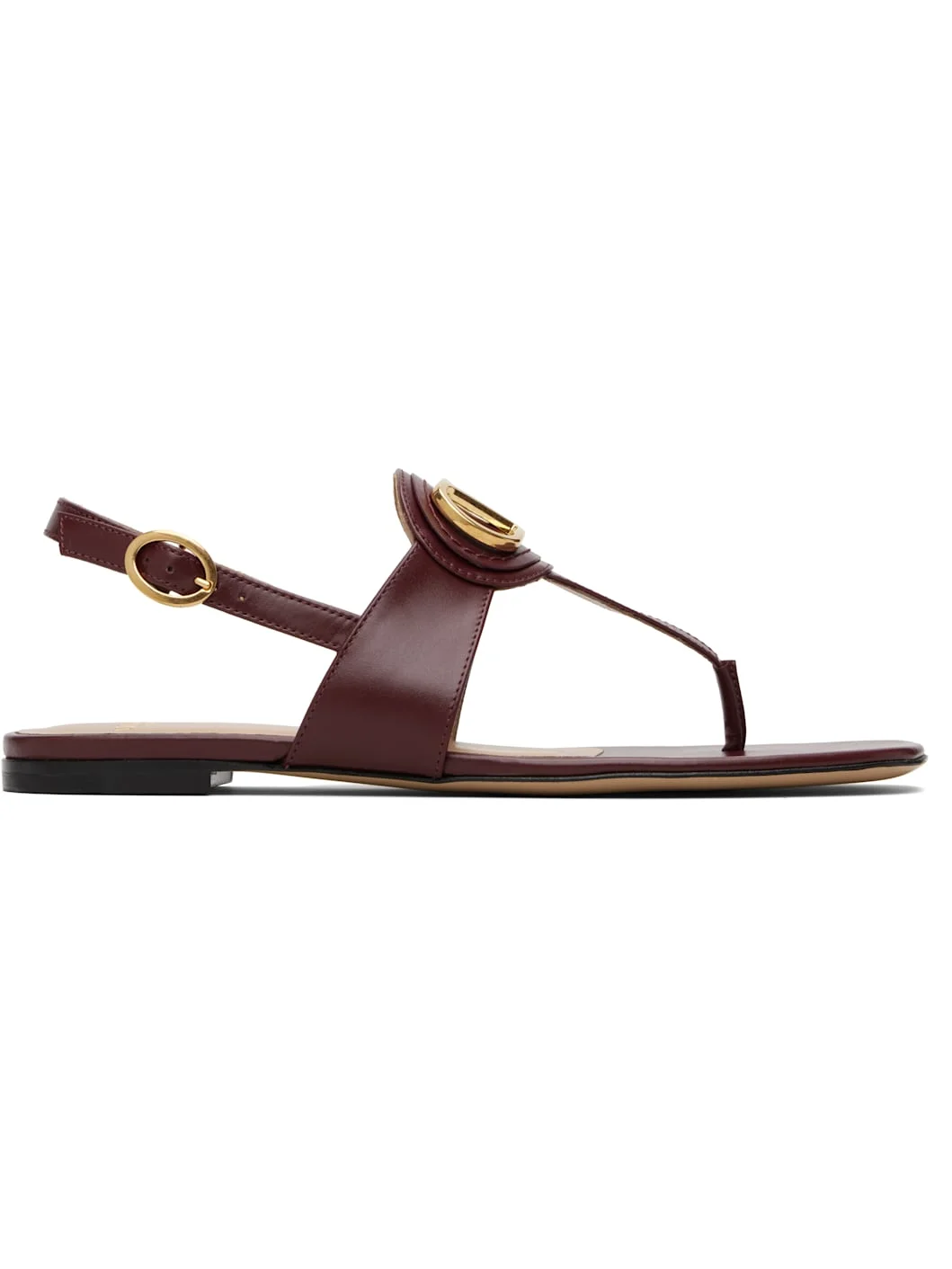 Buffed leather flat sandals. · Open square toe · Thong-style strap at vamp · Logo hardware at vamp · Pin-buckle slingback strap · Logo stamp at padded leather footbed · Stacked leather heel with rubber injection · Leather sole Supplier color: Brick ruby Leather. Made in Italy 252807F124001