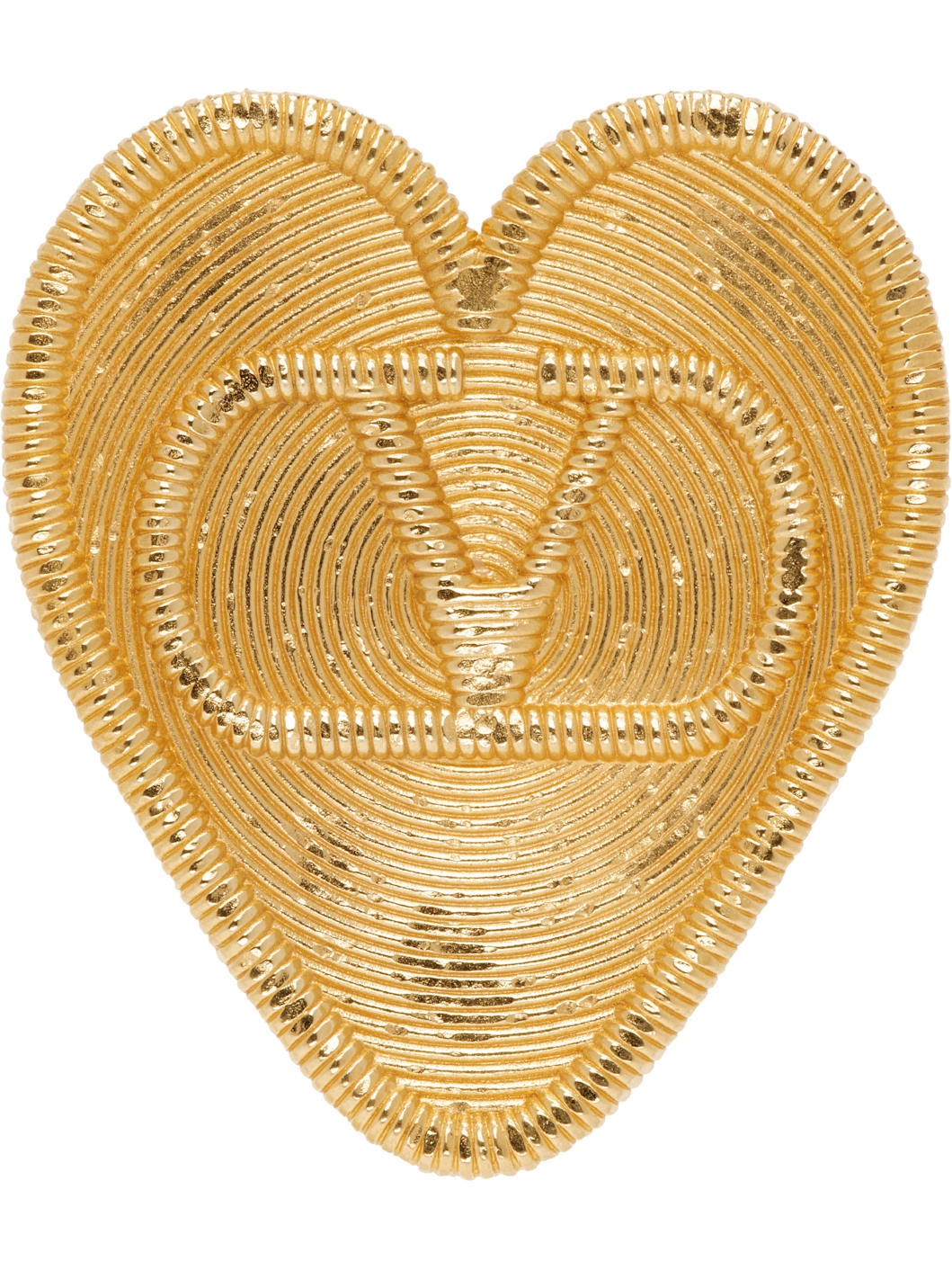 Heart-shaped brooch in gold tone. · Hammered detailing throughout · Logo at face · Safety-pin fastening · H2" x W2" Supplier color: Antique brass Metal. Made in Italy 251807F021004