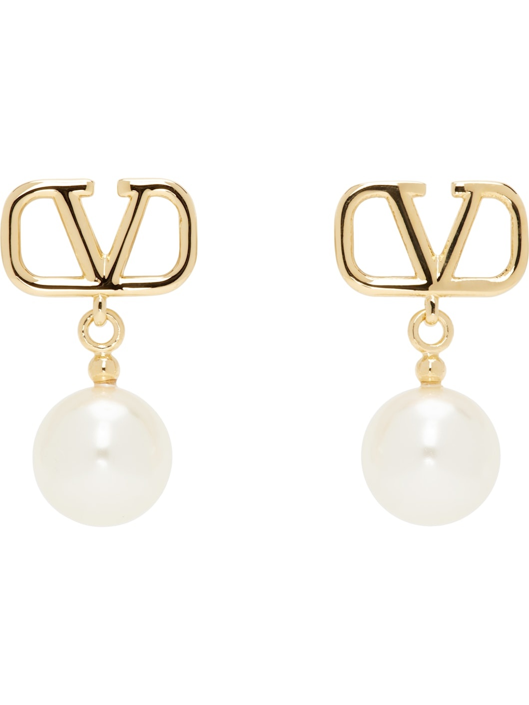 Pair of drop earrings in gold tone. · Logo at face · Swarovski pearl at drop · Post-stud fastening · H1" x W0.5" Supplier color: Gold Metal. Made in Italy 251807F022012