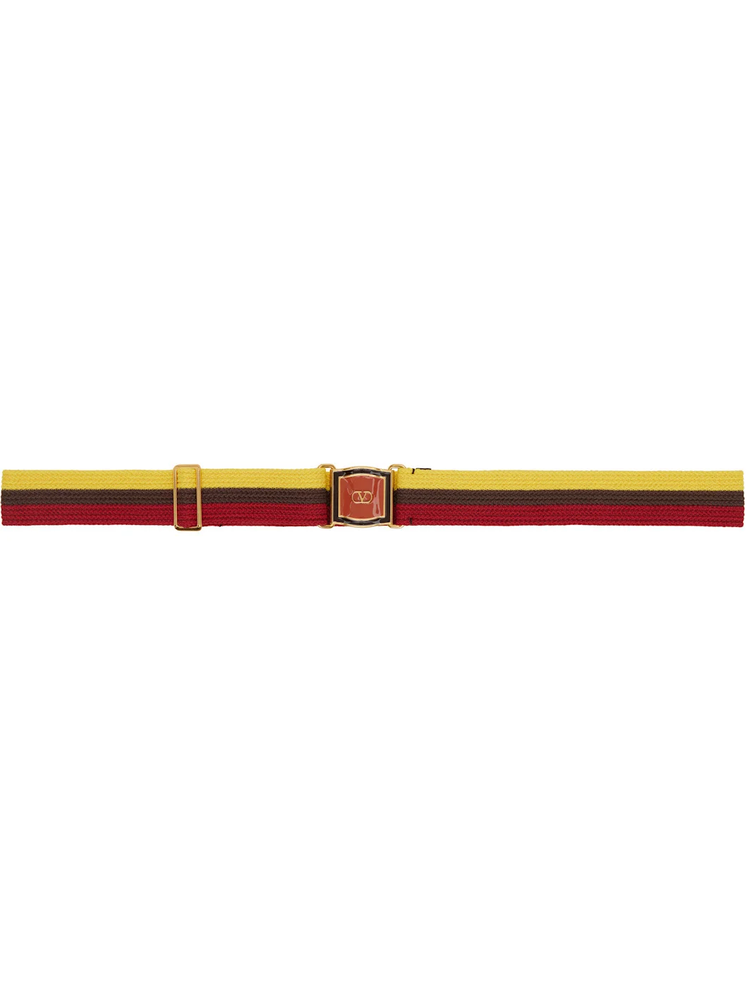 Webbing belt. · Stripes throughout · Cinch fastening at length · Logo hardware at enameled hook-eye fastening · W1.5" Supplier color: Yellow/Brown/Red Textile. Made in Italy 252807M131000