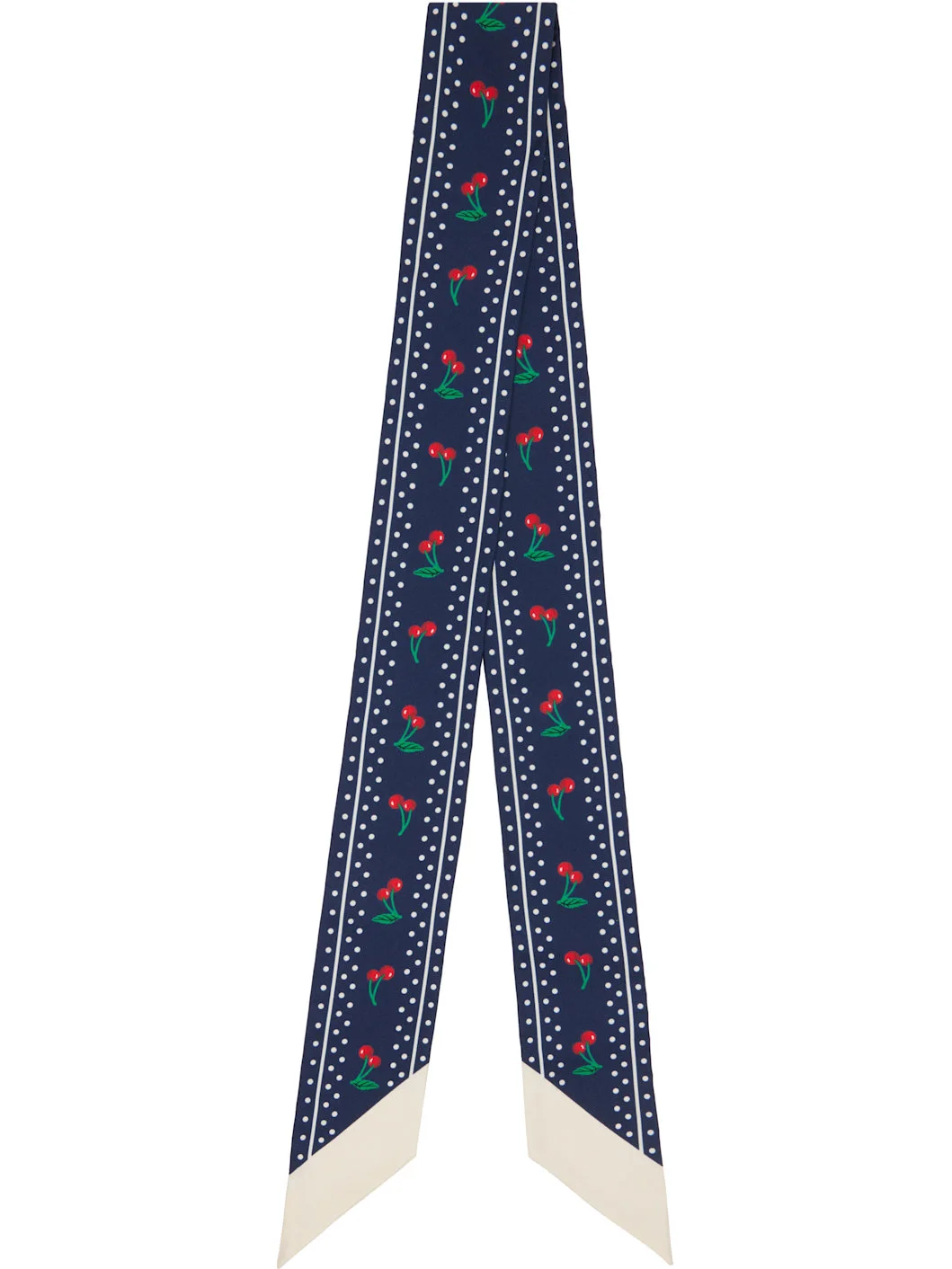 Rectangular silk satin skinny scarf. · Graphic pattern printed throughout · Logo printed at face and back face · L45.5" x W2.5" Supplier color: Ceu blu/Rosso/Verde 100% silk. Made in Italy 252807F029001