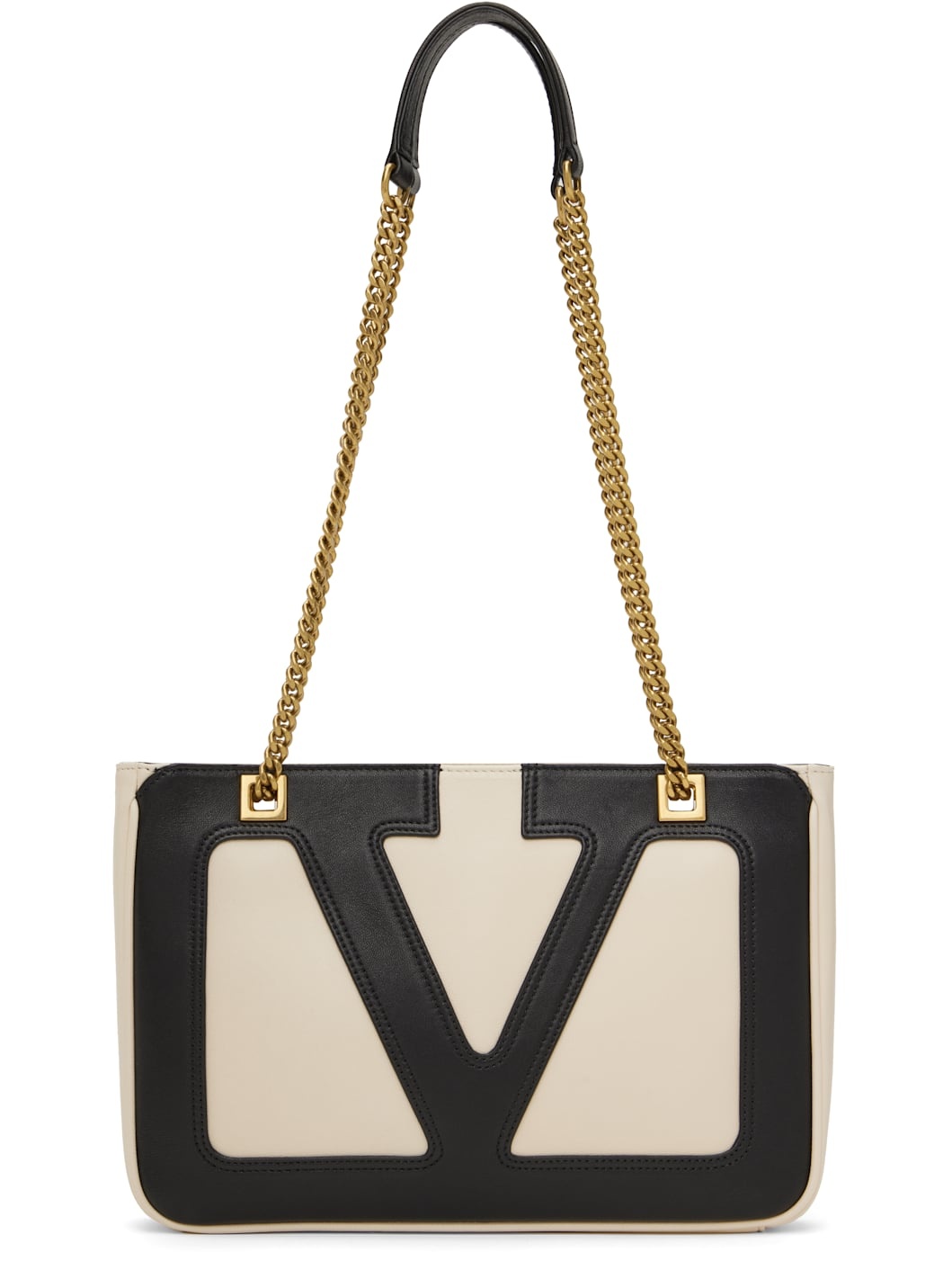 Grained nappa leather shoulder bag in off-white and black. · Sliding curb chain shoulder strap · Logo applique at face · Zip pocket at back face · Zip closure · Nappa leather lining · Antiqued brass-tone hardware · H7" x W10" x D1.5" Supplier color: Ivory/Black Leather. Made in Italy 251807F048015