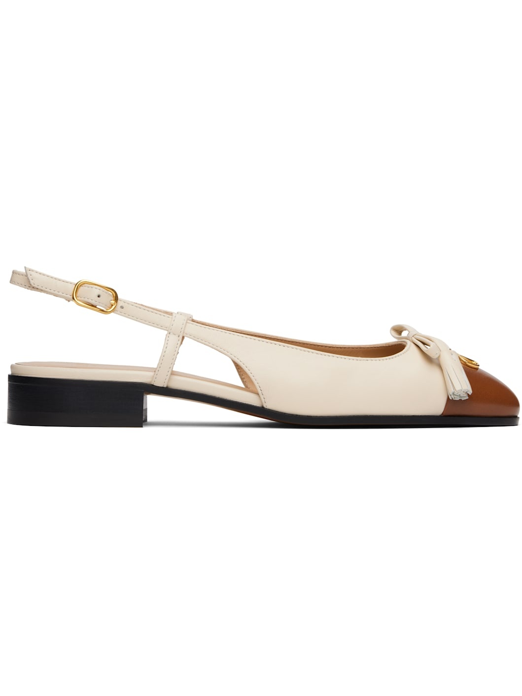 Buffed kidskin ballerina flats in off-white and brown. · Logo hardware at almond toe · Bow accent with tassels at vamp · Pin-buckle slingback strap · Stacked leather heel with rubber injection · Leather sole Supplier color: Butter/Tobacco Upper: kidskin. Sole: leather, rubber. Made in Italy 251807F118015