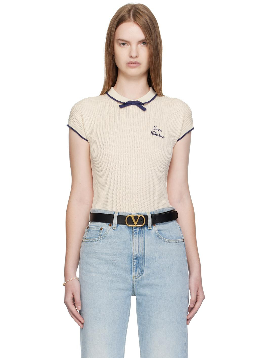 Open-knit cotton- and viscose-blend top. · Jacquard stripe at rib-knit spread collar and cuffs · Bow accent at collar · Logo embroidered at chest · Rib-knit hem · Cap sleeves Supplier color: Birch/Provence blue/Birch Body: 54% cotton, 46% viscose. Trim 1: 100% polyester. Trim 2: 100% cotton. Made in Italy 252476F110003