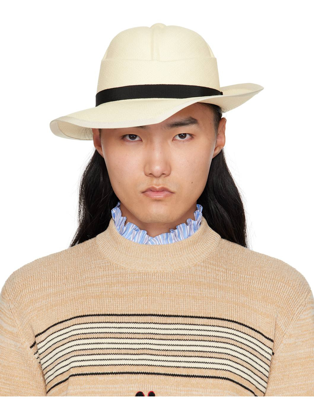 Rigid woven straw panama hat. · Grosgrain hatband · Logo hardware at side · Grosgrain trim at brim Supplier color: Naturale/Nero/Antique brass Body: 100% straw. Trim: 54% cotton, 46% viscose. Made in Italy 252807M140001