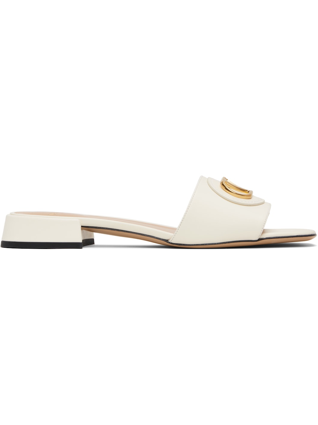 Buffed calfskin flat sandals in off-white. · Open square toe · Logo hardware at vamp · Logo stamp at padded footbed · Covered block heel with rubber injection · Leather sole Supplier color: Ivory Upper: calfskin. Sole: leather, rubber. Made in Italy 251807F124028