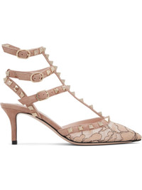 Lace and buffed leather heels. · Suede trim and pyramid studs throughout · Pointed toe · Pin-buckle ankle straps · Suede-covered kitten heel with rubber injection · Leather sole with rubber injection · Heel: H2.5" Supplier color: Skin Upper: textile, leather. Sole: leather. Made in Italy 252807F122025
