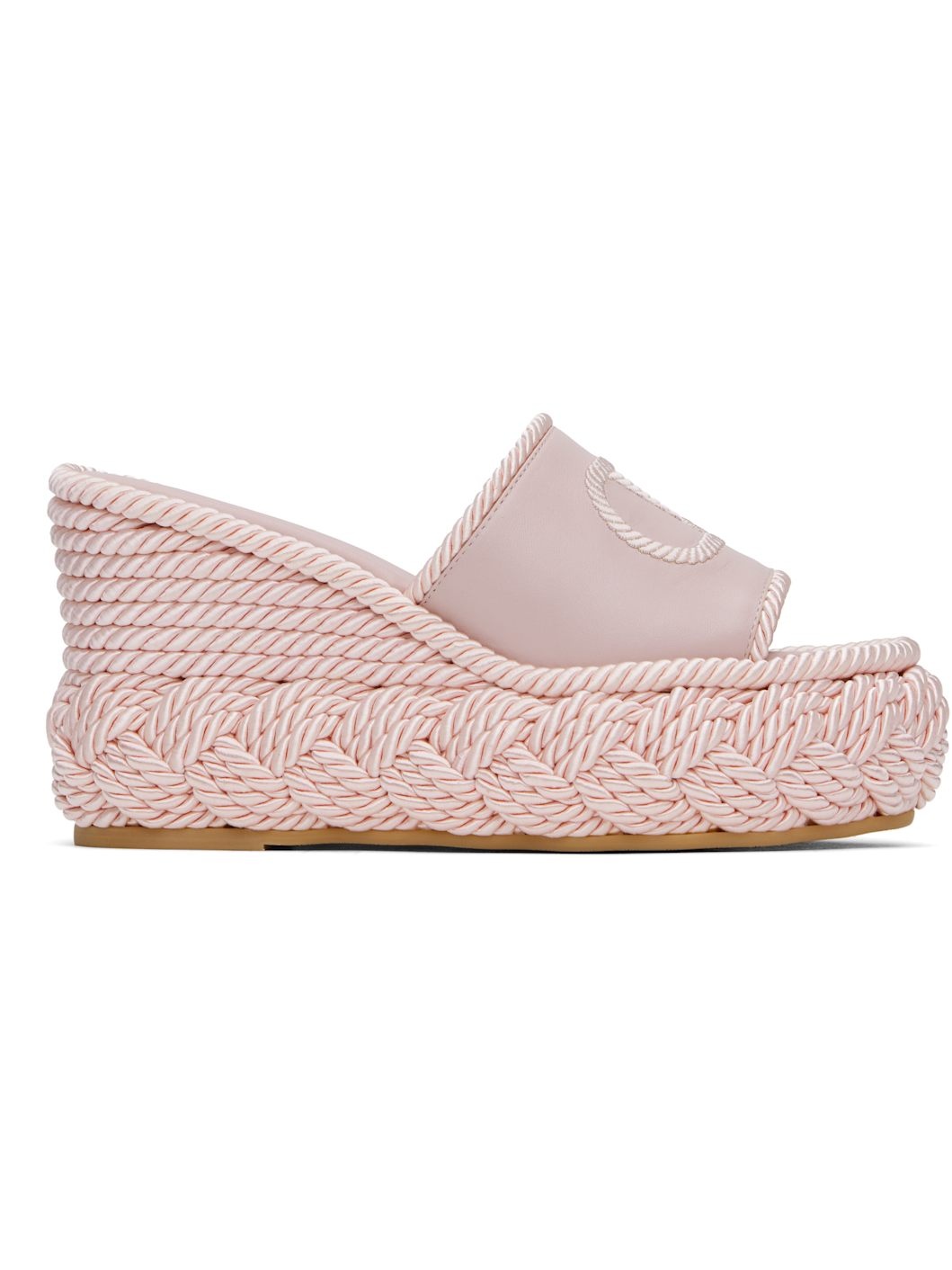 Buffed leather and silk torchon heeled sandals in pink. · Open toe · Logo-embroidered strap at vamp · Grosgrain trim at inner side · Buffed leather lining · Logo stamp at padded footbed · Covered platform midsole and wedge heel · Treaded rubber sole · Platform: H2" · Heel: H4" Supplier color: Water rose Upper: leather, textile. Sole: rubber. Made in Spain 251807F119003