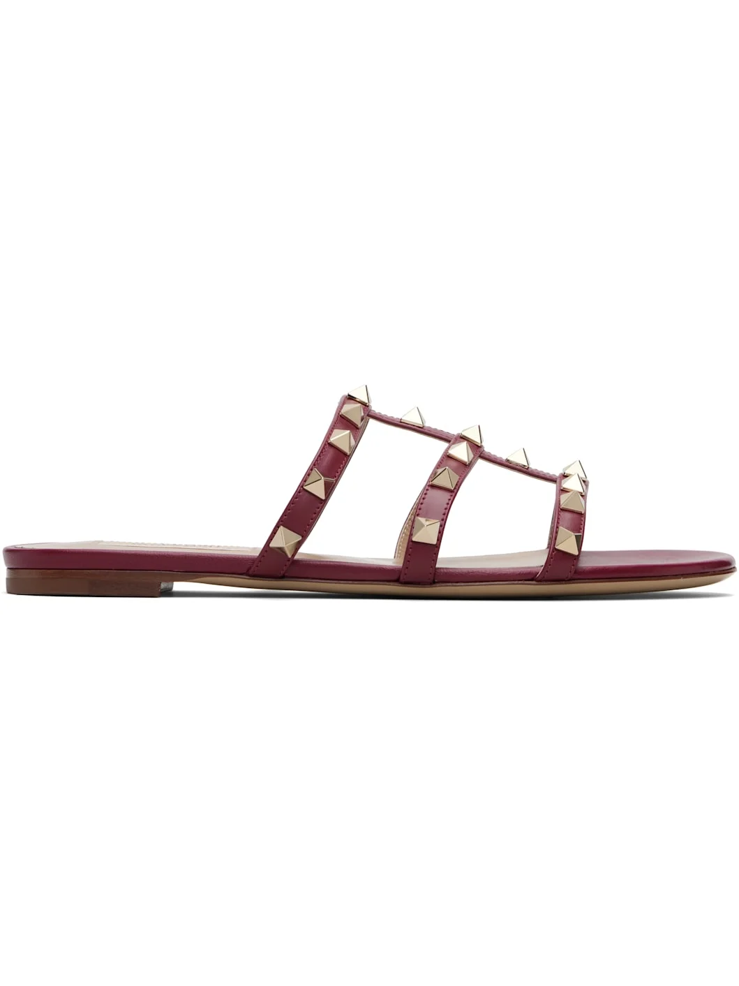 Buffed leather flat sandals. · Open toe · Straps with pyramid studs at vamp · Logo patch at leather footbed · Stacked heel with rubber injection · Leather sole Supplier color: Insolent Leather. Made in Italy 252807F124011