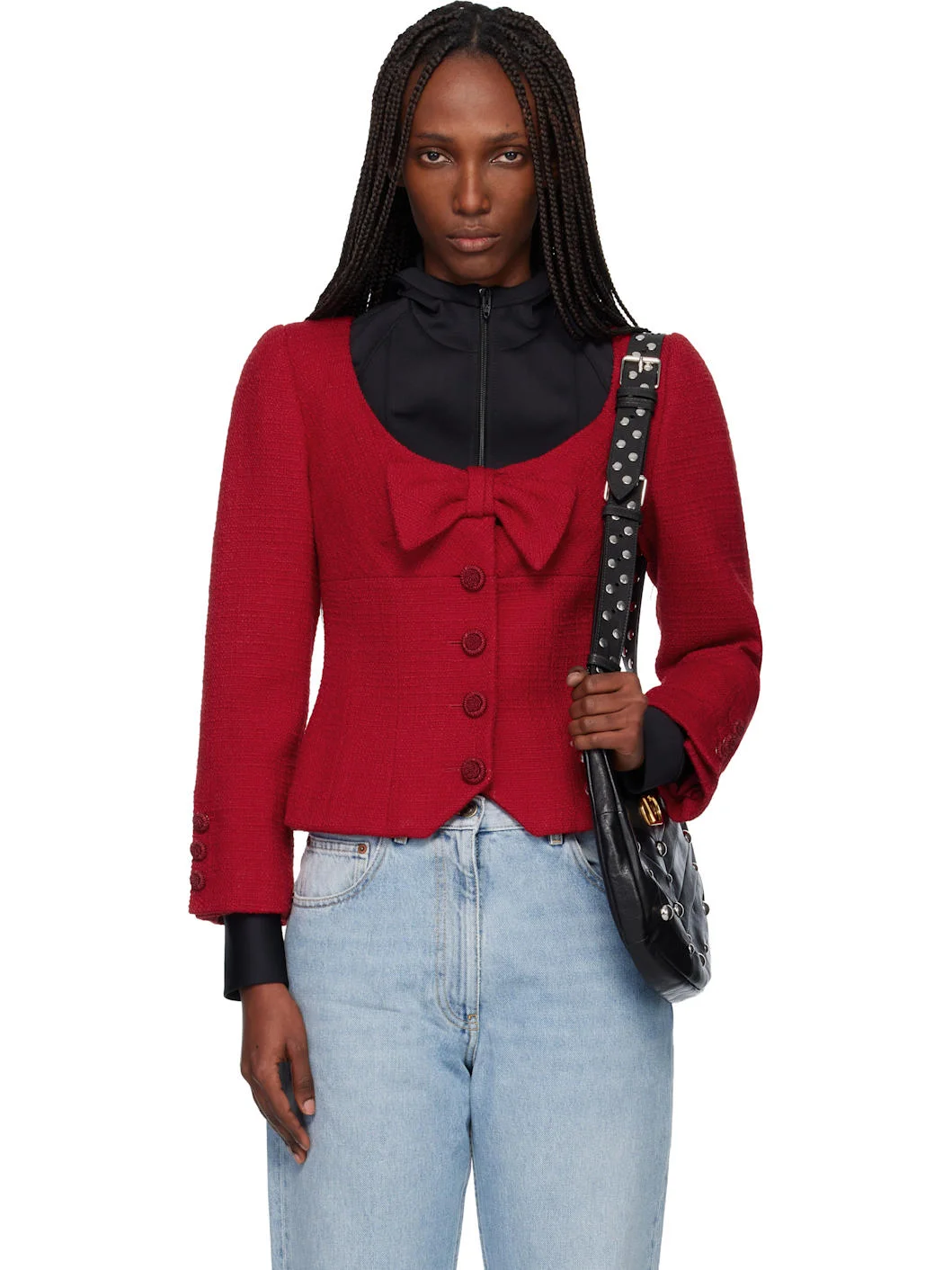 Virgin wool-blend tweed jacket. · Paneled construction · Bow accent at scoop neck · Button closure · Vent at front hem · Padded shoulders · Buttoned surgeon's cuffs · Darts at back · Full crepe lining Supplier color: Paris Body: 97% virgin wool, 3% polyamide. Lining: 74% acetate, 26% silk. Made in Italy 252476F063002