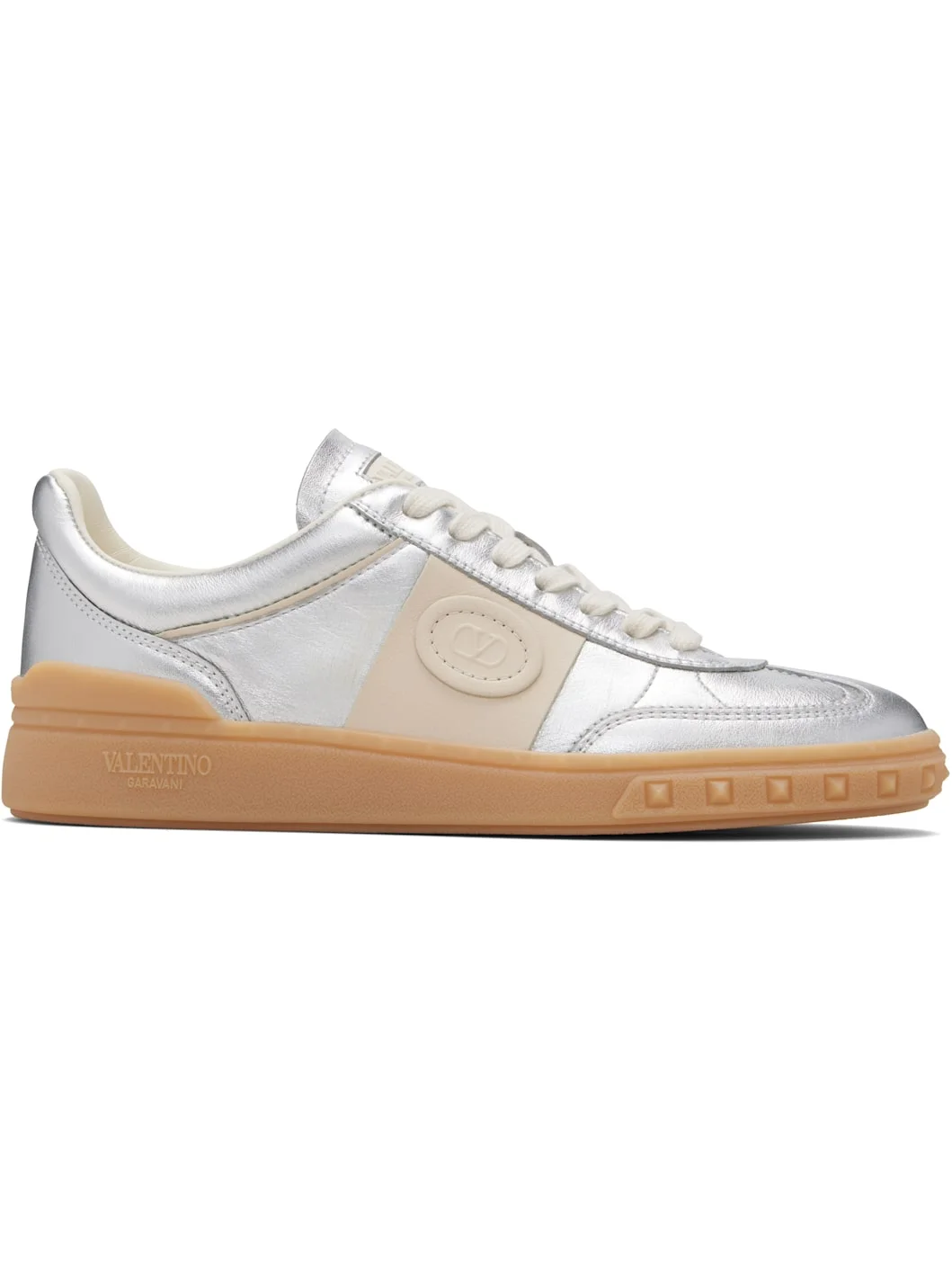 Low-top laminated calfskin sneakers. · Lace-up closure · Inset rubberized logo patch at padded tongue · Padded collar · Logo patch at outer side · Buffed leather lining · Embossed logo and pyramid studs at crepe rubber midsole · Treaded rubber sole Supplier color: Silver Upper: calfskin. Sole: rubber. Made in Italy 252807F128005