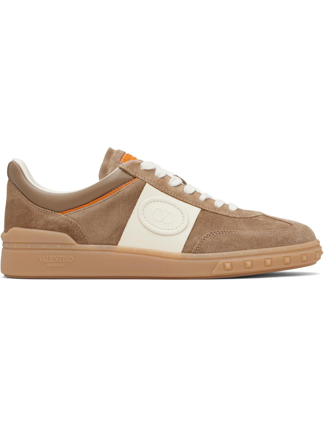 Low-top suede and nappa calfskin sneakers. · Lace-up closure · Rubberized logo patch at padded tongue · Padded collar · Logo patch at outer side · Mesh lining · Signature pyramid studs at welt · Treaded rubber sole Supplier color: Khaki/Ivory Upper: calfskin, leather. Sole: rubber. Made in Italy 252807M237000