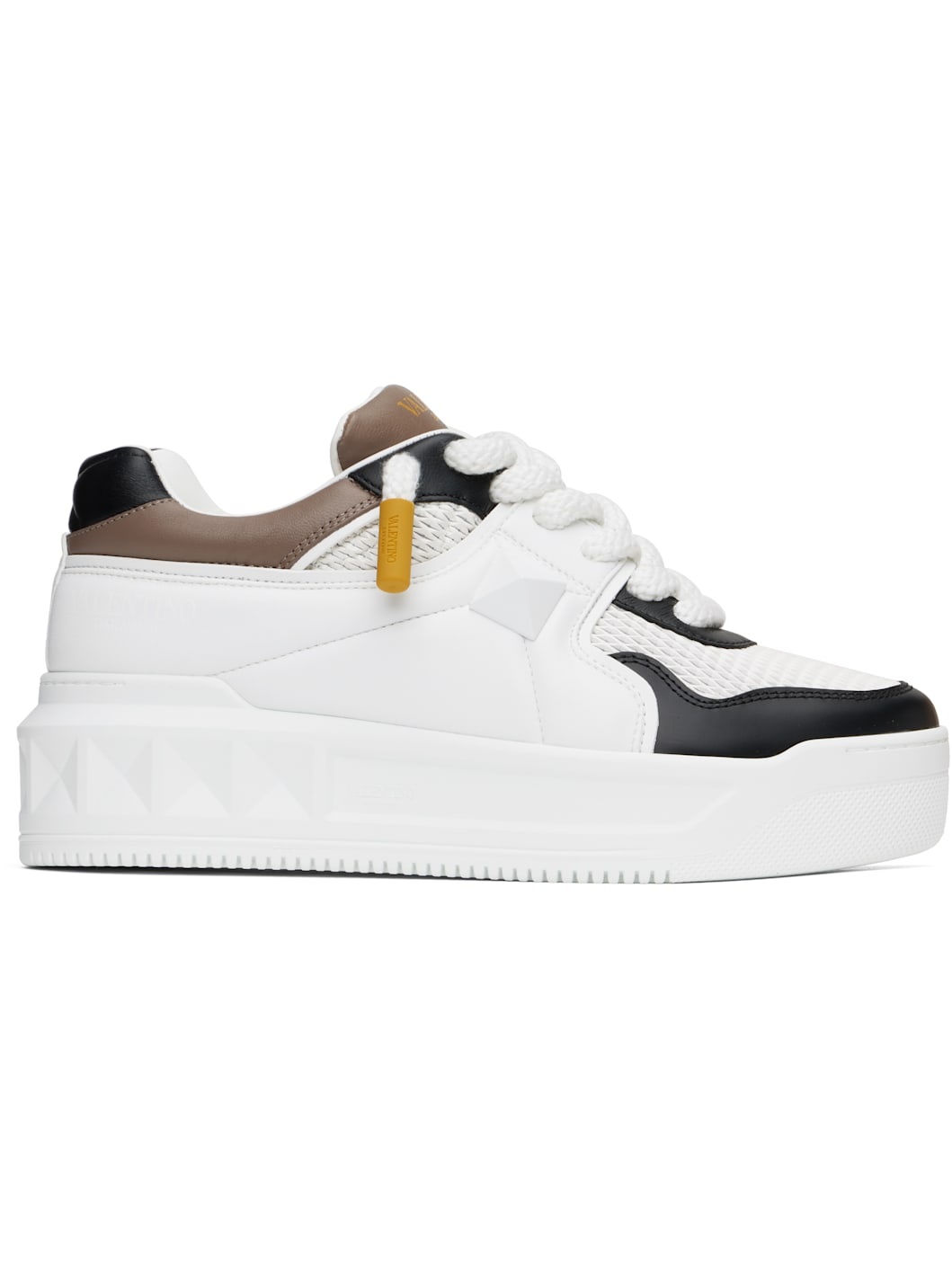 Low-top buffed nappa calfskin sneakers in white. - Perforated detailing throughout - Lace-up closure - Logo printed at tongue - Concealed elasticized gusset at tongue - Padded tongue and collar - Signature pyramid stud at outer side - Quilted heel tab - Buffed leather lining - Logo-embossed rubber platform midsole - Treaded rubber sole - Platform: H1.75 Supplier color: Bianco/Nero/Clay