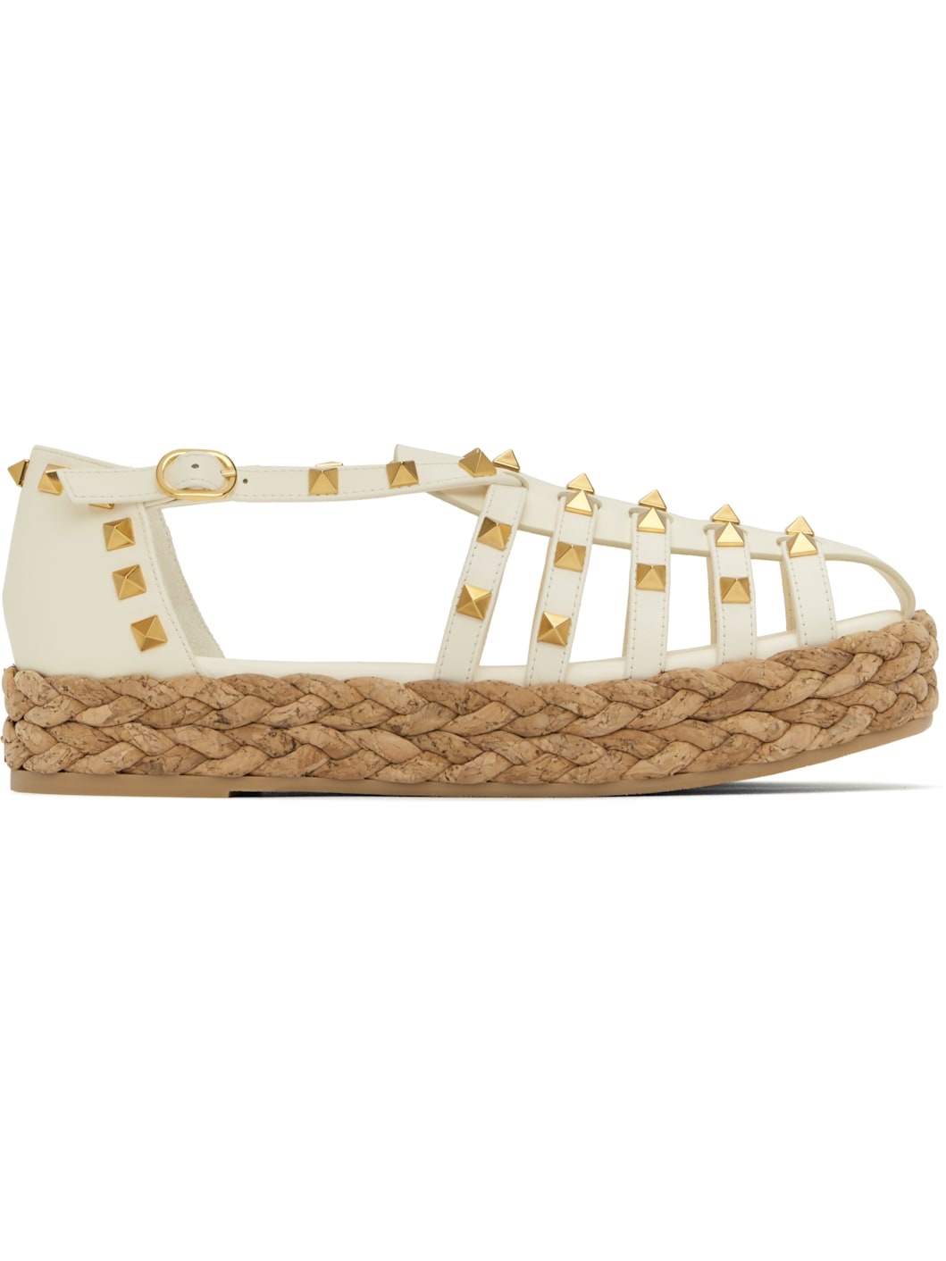 Buffed leather sandals in white. · Signature pyramid studs throughout · Straps at vamp · Pin-buckle strap at collar · Buffed leather and suede lining · Braided cork platform midsole · Treaded rubber sole · Antiqued brass-tone hardware · Platform: H1.5" Supplier color: Ivory/Natural Upper: leather. Sole: rubber. Made in Spain 251807F119001