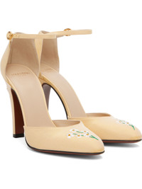 Faille heels. · Pointed toe · Floral embroidery at vamp and heel · Pin-buckle ankle strap · Buffed leather lining · Logo hardware at stiletto heel with rubber injection · Leather sole · Heel: H4" Supplier color: Black Upper: textile. Sole: leather. Made in Italy 252807F122010