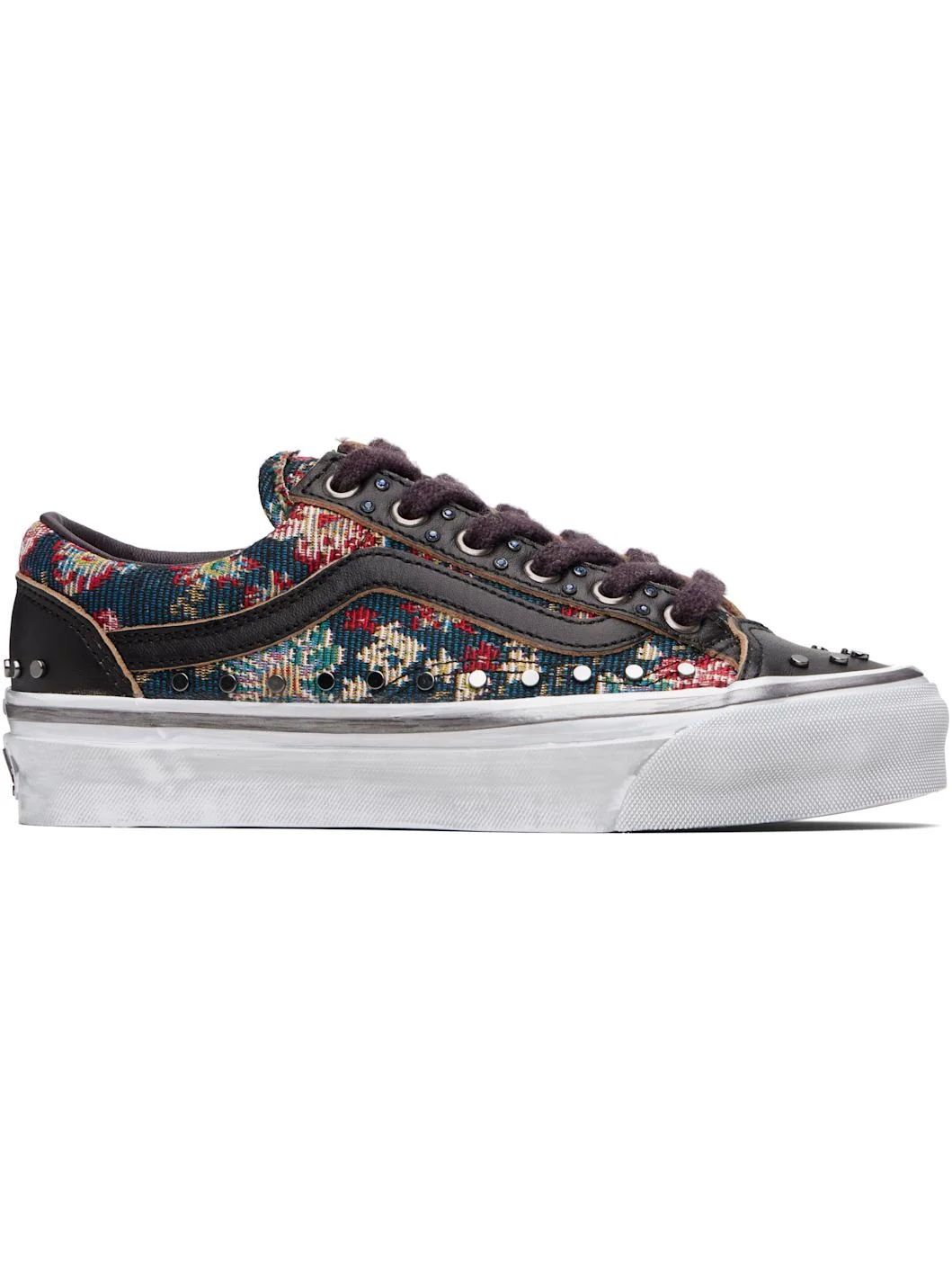 Low-top 14 oz duck canvas and grained leather sneakers. · Jacquard floral pattern and rivets throughout · Lace-up closure · Padded tongue and collar · Grained leather Sidestripe™ at sides · Rubberized logo patch at heel · Sola Foam ADC insole · Treaded Vibram® Waffle Vulc rubber sole · Contrast stitching in white Supplier color: Floral rivets black Upper: leather, textile. Sole: rubber. Made in Philippines 261739F128011