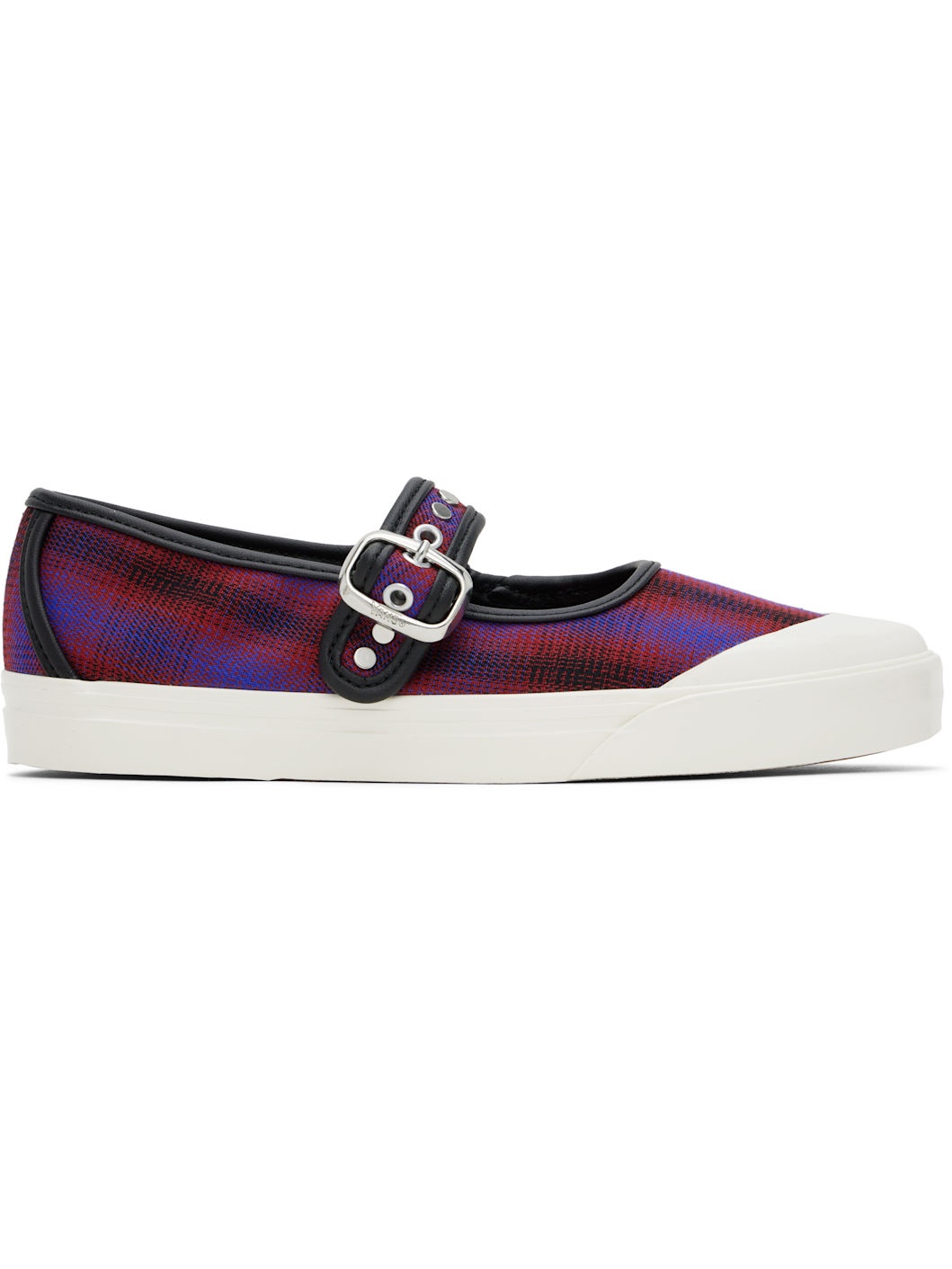 Plain-woven Mary Jane-style ballerina flats in red. · Check pattern and grained faux-leather trim throughout · Rubber cap toe · Pin-buckle strap with studs at vamp · Logo printed at padded footbed · Grained faux-leather lining · Treaded rubber sole Supplier color: Prep plaid chili pep Upper: textile, synthetic. Sole: rubber. Made in Viet Nam 242739F121001
