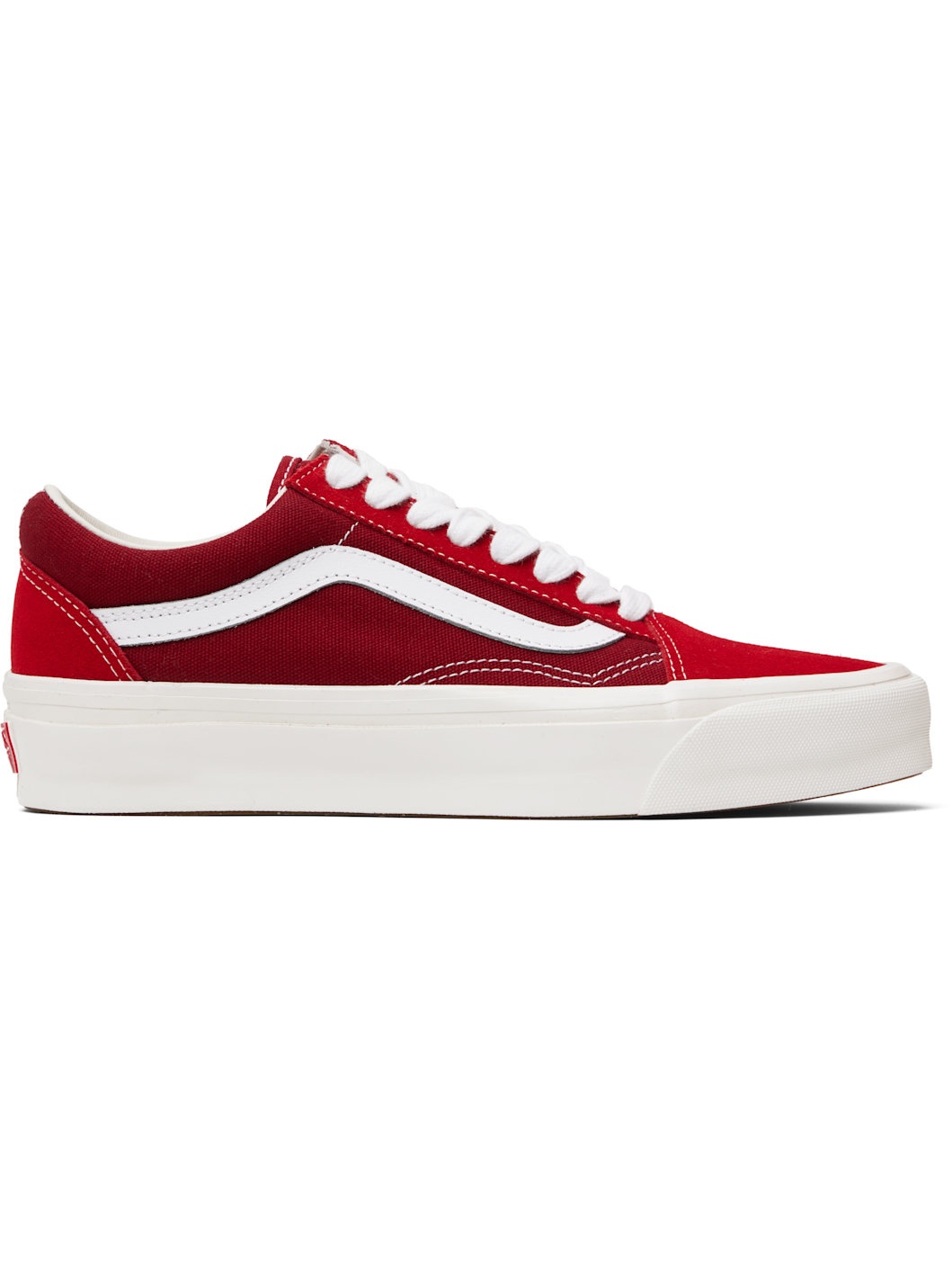 Low-top 8 oz canvas and suede sneakers in red. · Lace-up closure · Padded tongue and collar · Grained leather Sidestripe™ at sides · Padded Sola ADC foam footbed · Rubberized logo patch at heel · Treaded rubber sole · Contrast stitching in white Part of the Premium Old Skool Music Collection. Supplier color: Red Upper: textile, leather. Sole: rubber. Made in Philippines 251739M237037