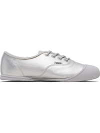 Low-top grained leather sneakers. · Rubber cap toe · Lace-up closure · Logo flag at outer side · Treaded rubber sole Supplier color: Silver metallic Upper: leather. Sole: rubber. Made in Viet Nam 261739F128009
