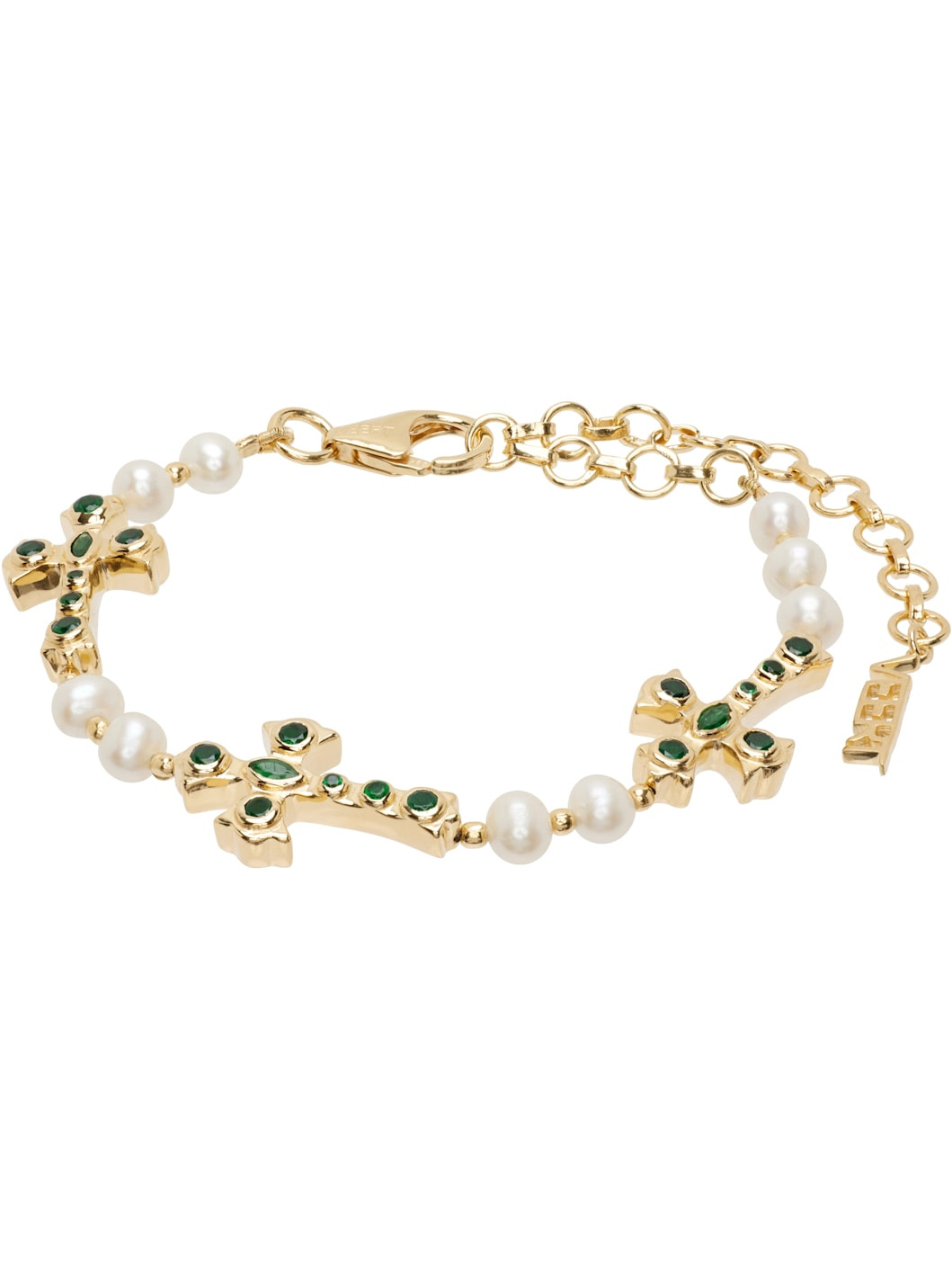 Handcrafted cable chain bracelet in 18k yellow gold vermeil. · Beaded freshwater pearls throughout · Charms with green cubic zirconia stones · Logo charm at adjustable lobster-clasp fastening · L9.5" Supplier color: Yellow gold/Green 18k gold vermeil, 925 sterling silver, freshwater pearl, cubic zirconia. Made in Italy 252999M142000