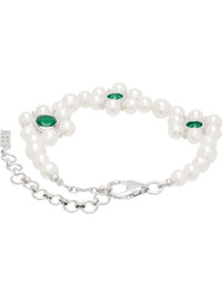Handcrafted beaded freshwater pearl bracelet. · Floral charms with green onyx stones at face · Logo charm at adjustable lobster-clasp fastening · 18k white gold vermeil hardware · L9.5" Supplier color: White gold 18k gold vermeil, 925 sterling silver, freshwater pearl, onyx. Made in Italy 252999M142003