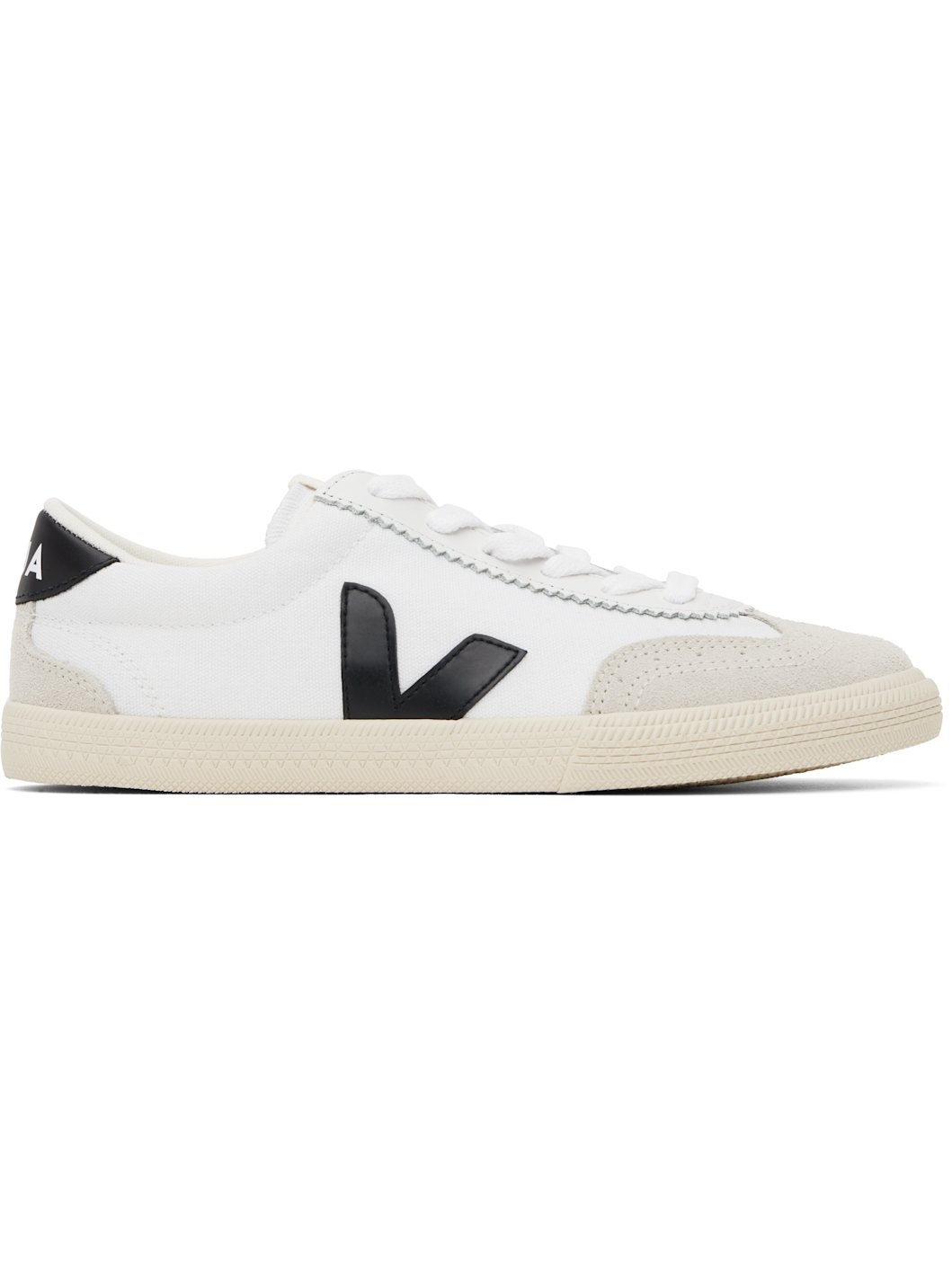 Low-top buffed leather, suede, and organic cotton canvas sneakers in white. · Perforated detailing at toe · Serrated trim at lace-up closure · Logo patch at padded tongue · Padded collar · Logo applique at sides · Logo printed at heel tab · Recycled polyester jersey lining · Treaded rubber sole Supplier color: White/Black Upper: textile, leather. Sole: rubber. Made in Brazil 251610M237012