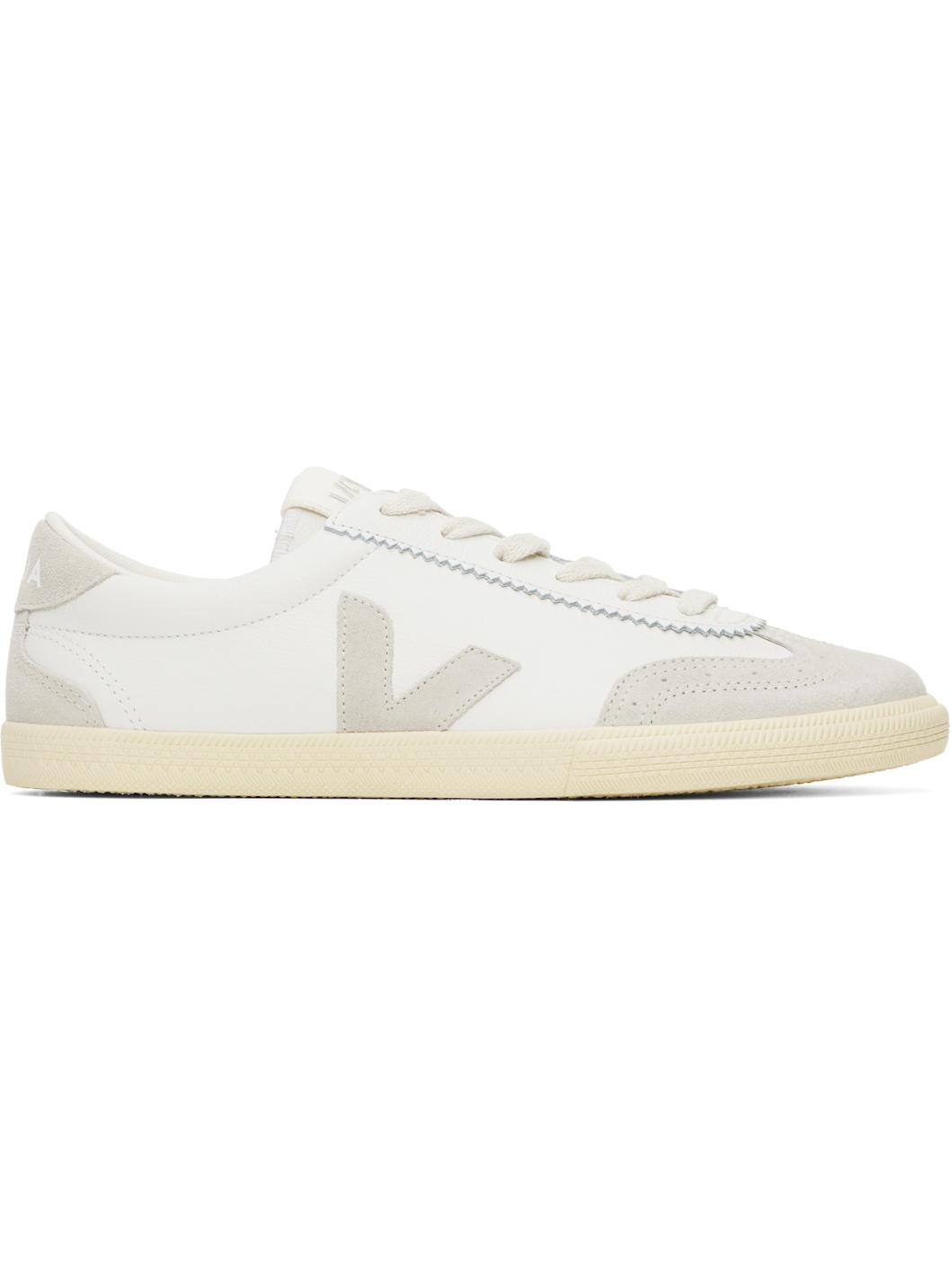 Low-top grained organic leather and suede sneakers in white and gray. · Perforated detailing at toe · Serrated trim at lace-up closure · Logo patch at padded tongue · Padded collar · Logo applique at sides · Logo printed at heel tab · Recycled polyester jersey lining · Treaded rubber sole Supplier color: White/Natural Upper: organic leather. Sole: rubber. Made in Brazil 251610M237036