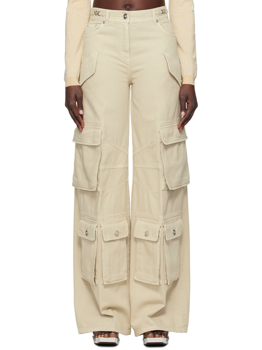 Wide-leg stonewashed non-stretch denim cargo pants. · Belt loops and Medusa hardware at waistband · Five-pocket styling · Zip fly · Bellows pockets at front · Darts at inseams · Flap pocket and bellows pocket at outseams · Logo patch at back waistband Supplier color: Beige 100% cotton. Made in Italy 242404F069002