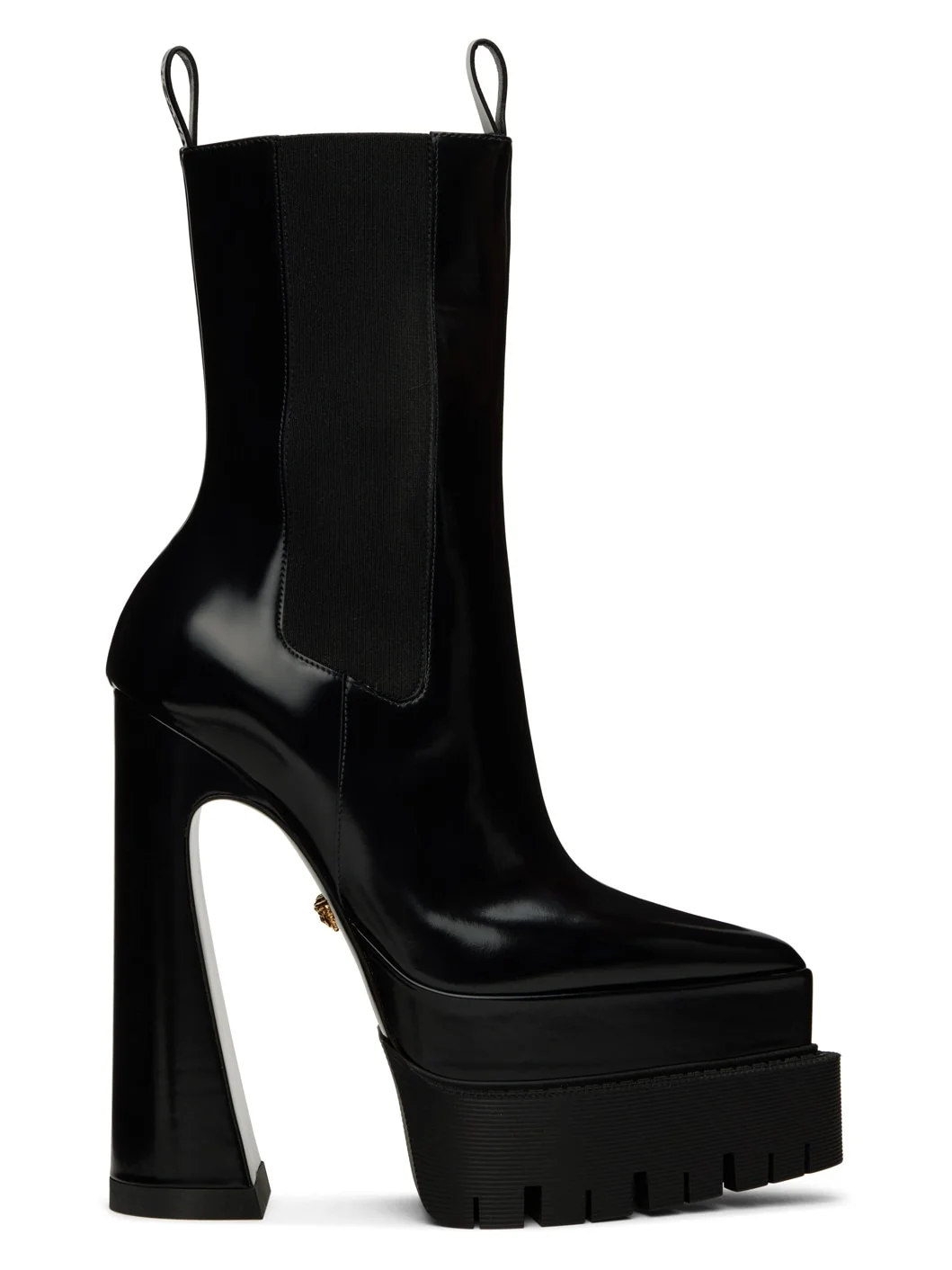 Ankle-high patent calfskin boots in black. · Pointed toe · Pull-loops at collar · Elasticized gusset at sides · Covered block heel with rubber injection · Signature Medusa hardware at treaded rubber sole · Platform: H2.75 in · Heel: H6.5 in Supplier color: Black