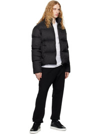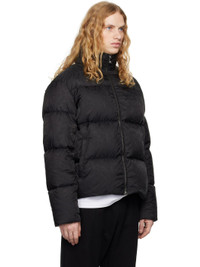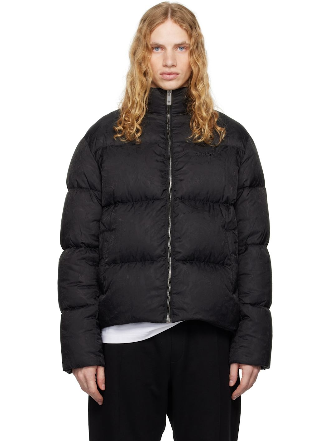 Nylon taffeta down jacket. Jacquard graphic pattern throughout. · Funnel neck · Zip closure · Logo embroidered at chest · Welt pockets at front · Bungee-style drawstring at hem · Elasticized cuffs · Concealed zip pockets at interior · Fully lined Supplier color: Black Fill: 80% goose and duck down, 20% goose and duck feathers.