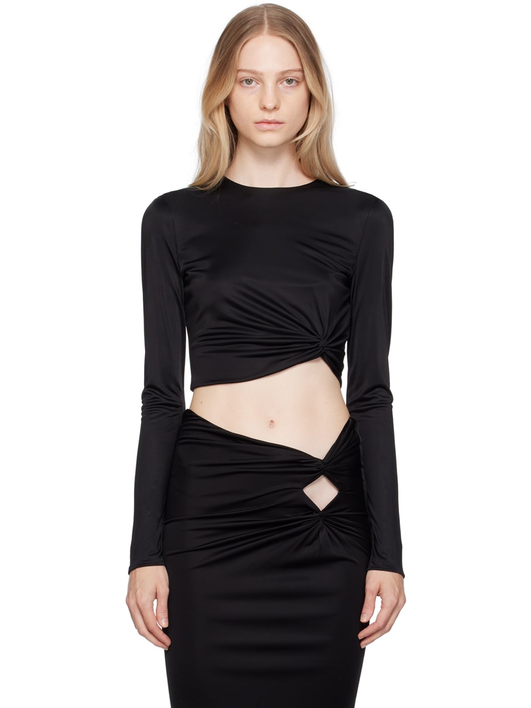 Viscose jersey T-shirt. Draping throughout. · Round neck · Knotted detailing at asymmetric cropped hem · Concealed zip closure at back Part of the Versace x Dua Lipa collaboration. Supplier color: Black Body: 100% viscose. Lining: 100% viscose. Made in Italy 232404F110003